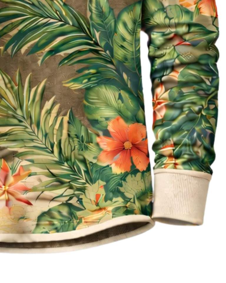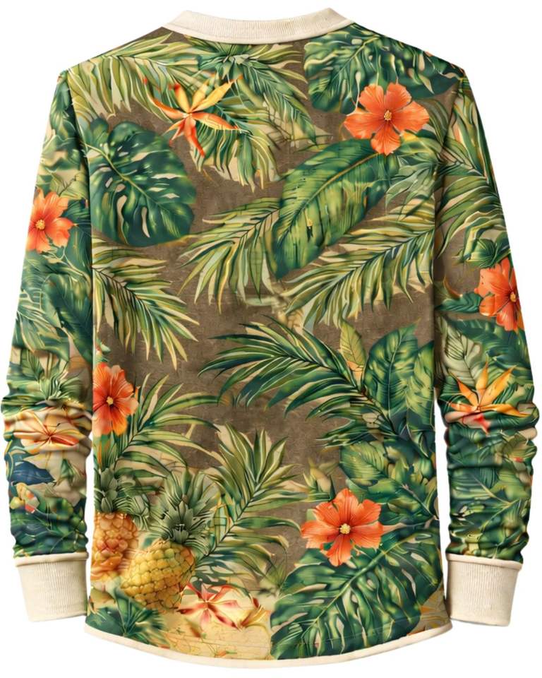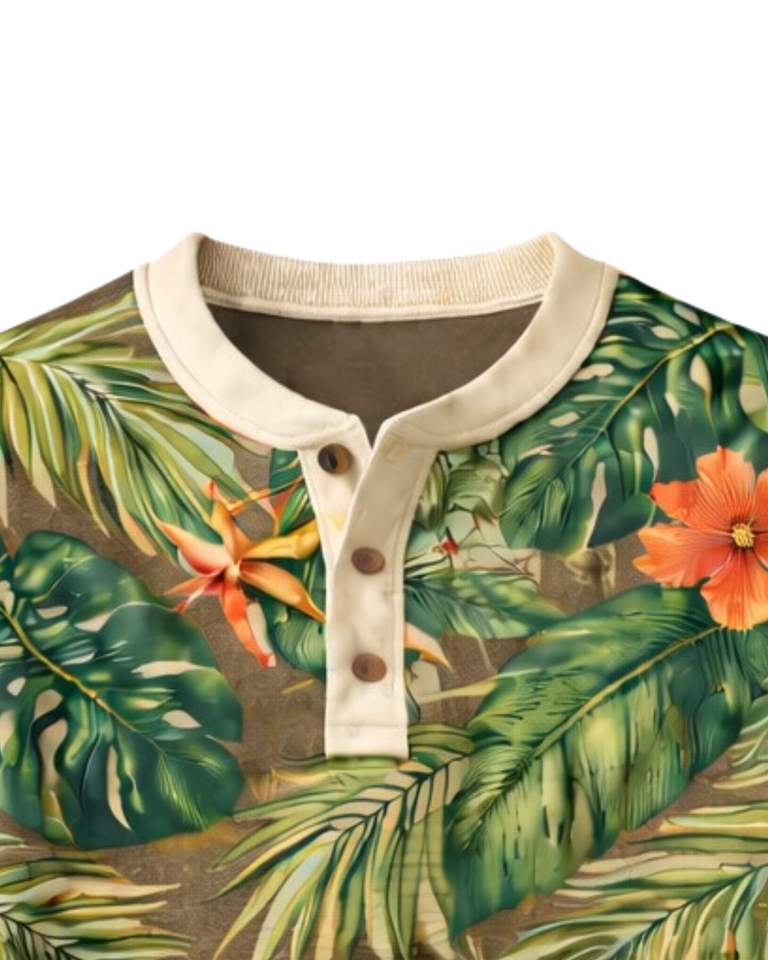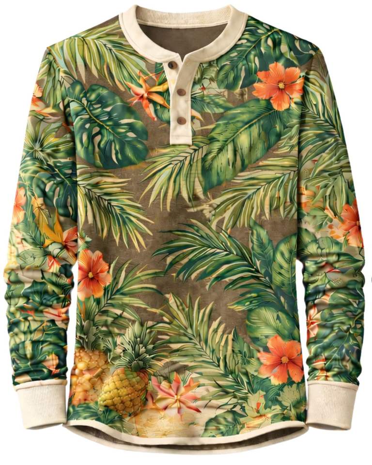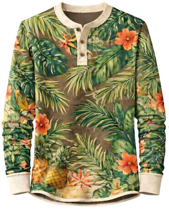 Mens Tropical Print Henley Shirt Green Floral Long Sleeve Button Placket Casual Summer Beach Style Lightweight Fashion Top