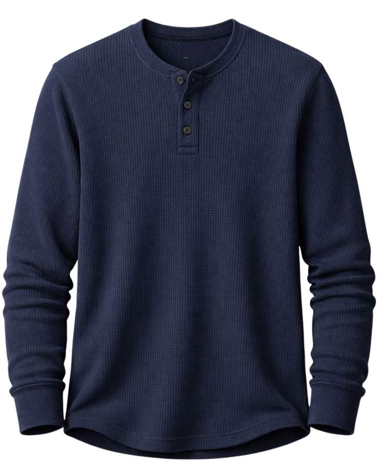 Mens Waffle Henley Long Sleeve Thermal T Shirt Navy Blue Casual Button Neck Winter Wear Top Cotton Slim Fit Breathable Fabric