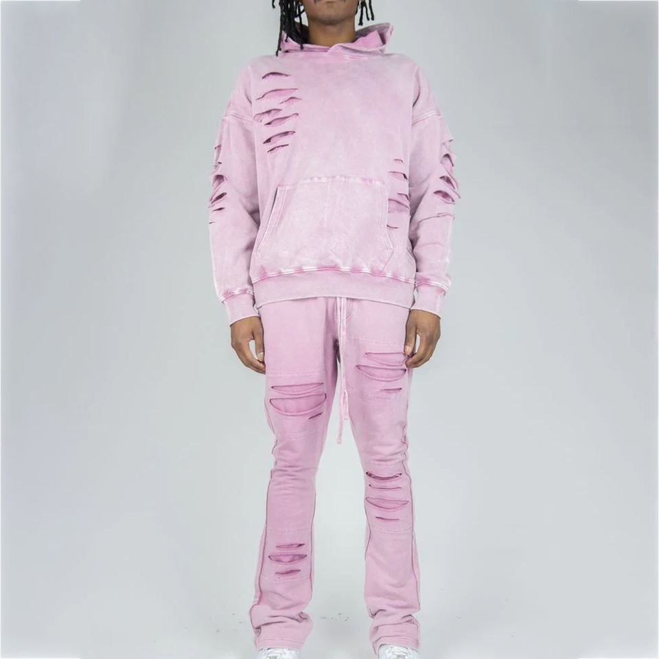 Mens Washed Distressed Tracksuit Casual Two Piece Set with Hoodie and Sweatpants Made Pakistan