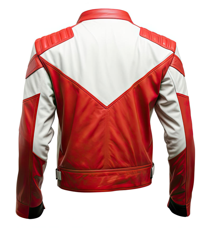 Mens White Red Genuine Sheepskin Stand Collar Zip-Up Quilted Shoulders Stylish Casual Winter Eco-Friendly Windproof Motorcycle
