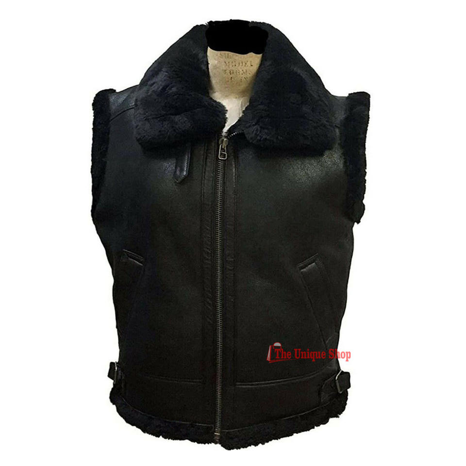 Mens Winter Flight Avi-Ator Fur Shearling Sheepskin Black Leather Vest - Casual Sleeveless Jackets Winter Waistcoat - Unisex