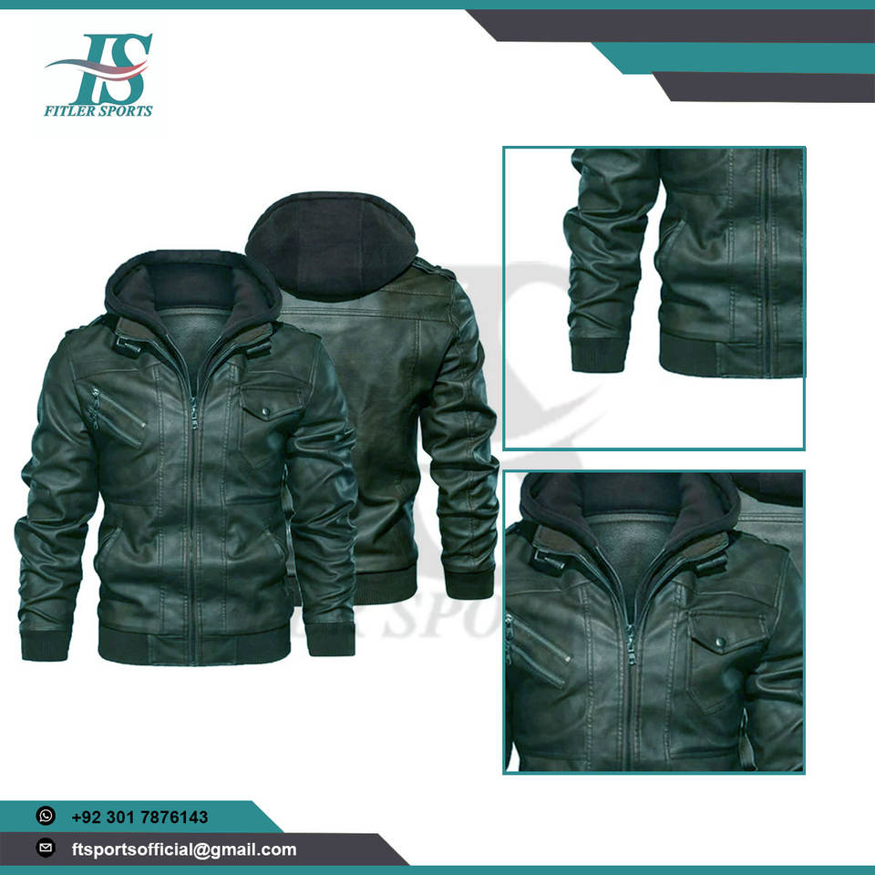 Mens Winter Leather Jacket Slim Fit Hooded Green Jacket with Warm Plush Lining