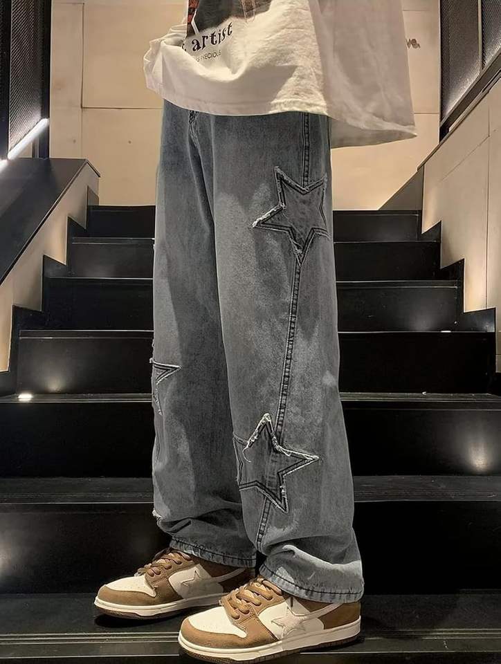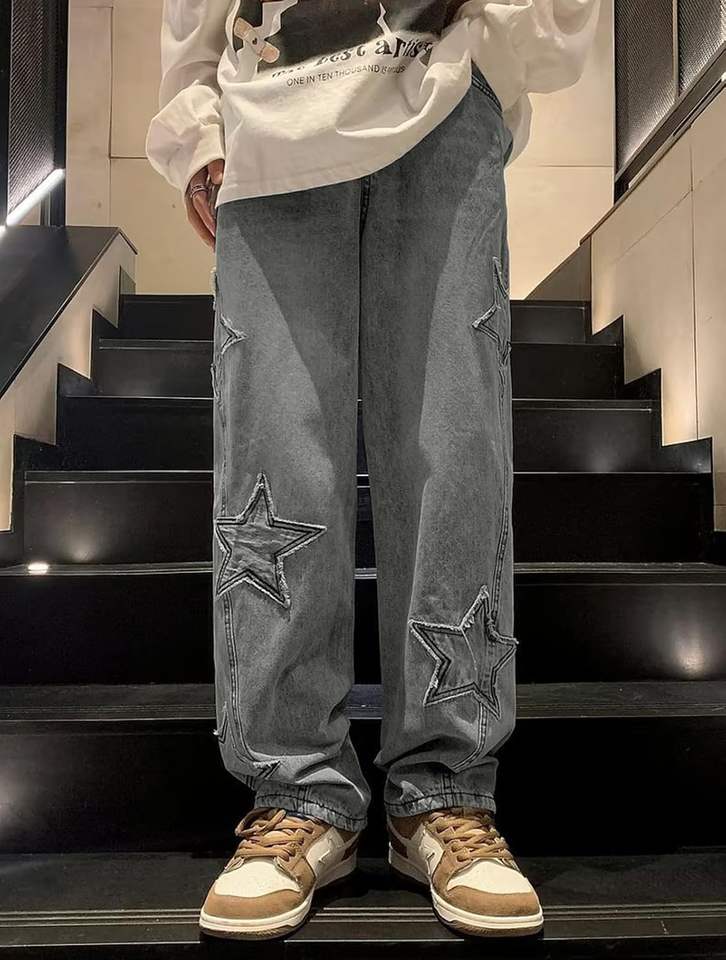 Men's Y2K Star Jeans with a High Waist, embodying Hip Hop Streetwear style These loose baggy jeans feature exquisite embroidery