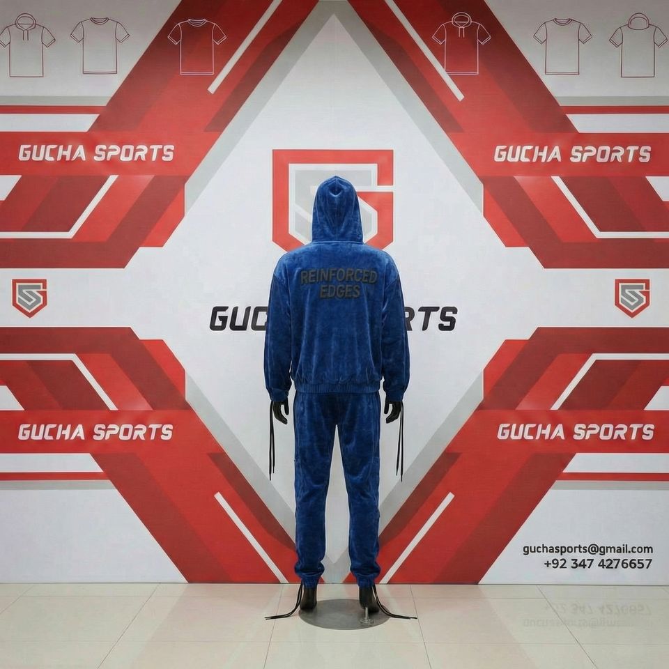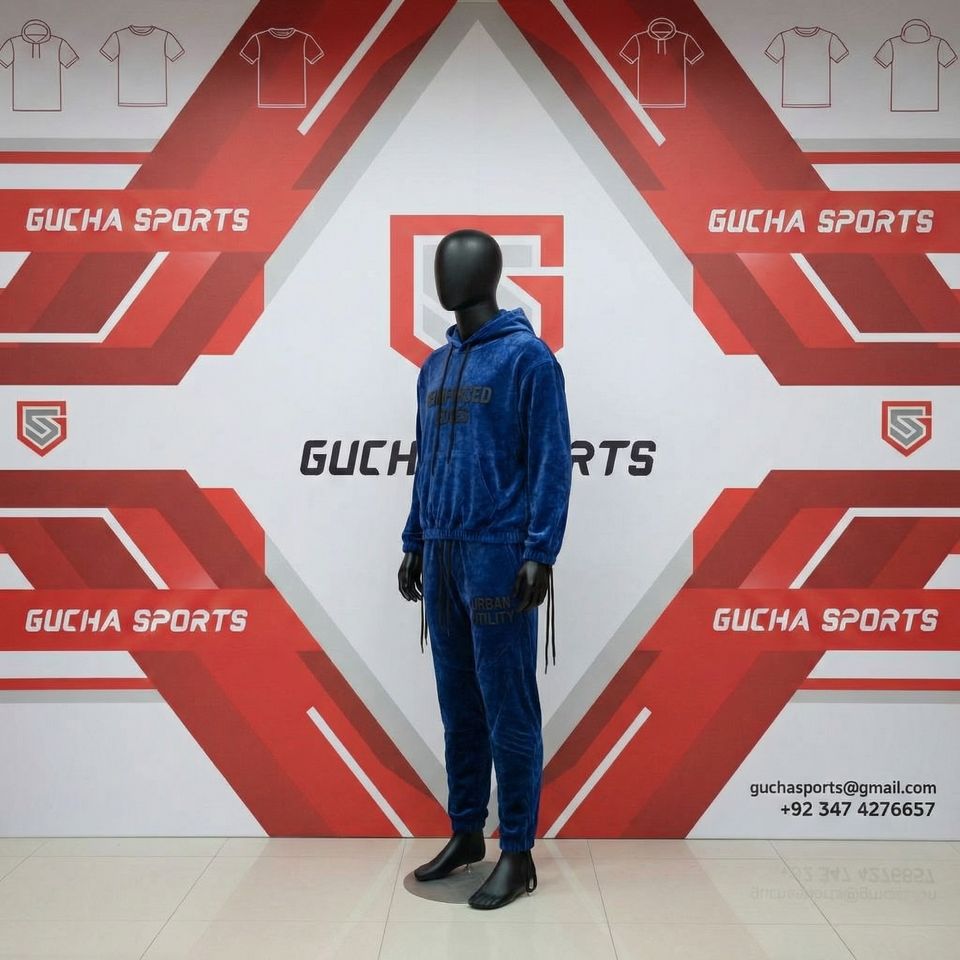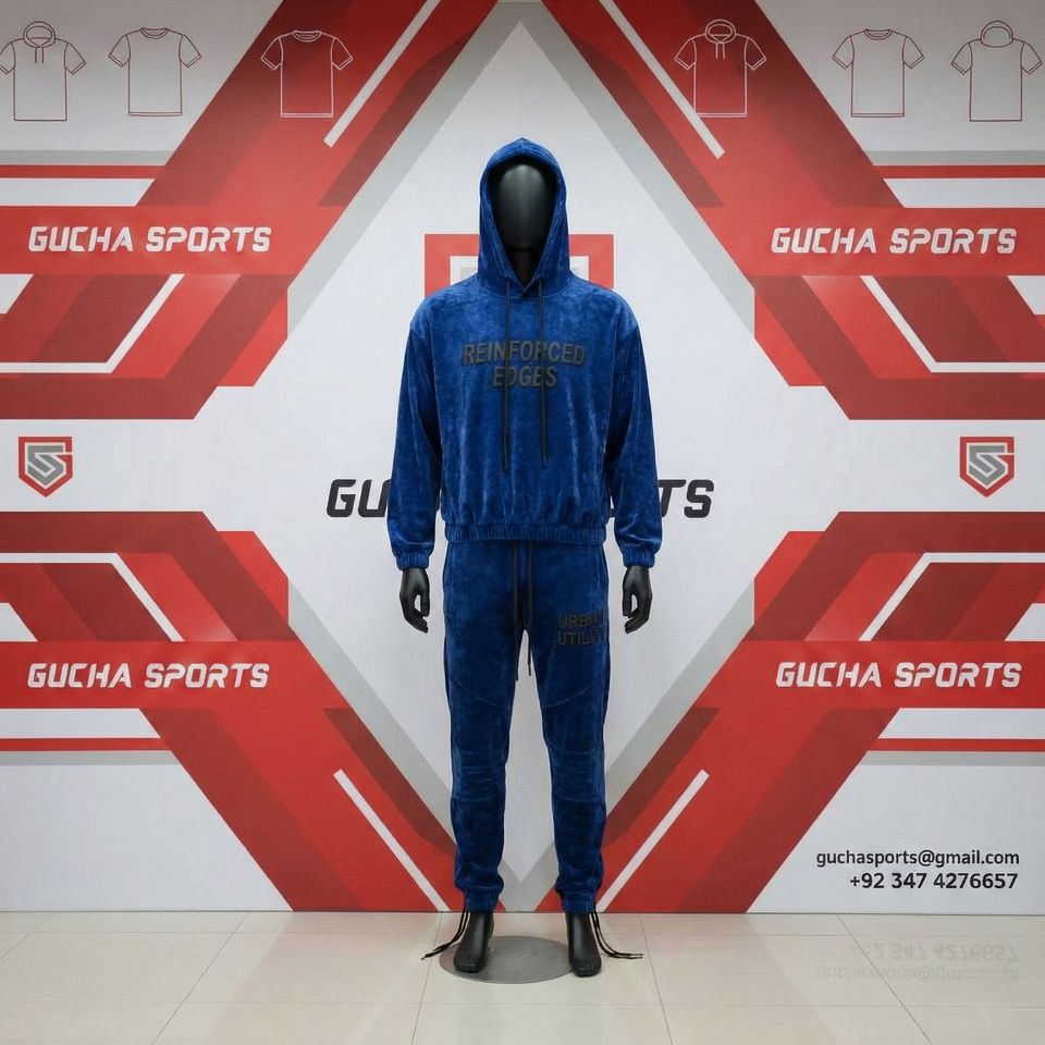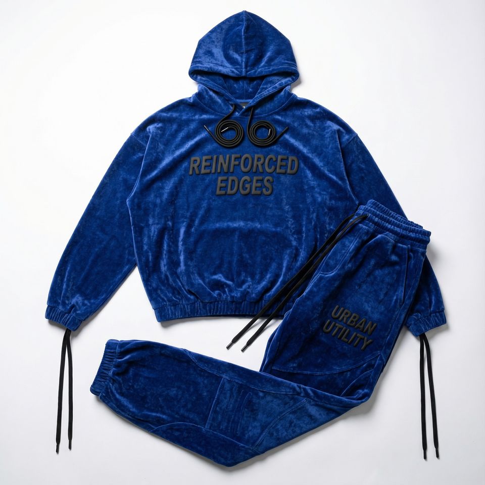 Mens blue velour tracksuit set with hoodie and jogger pants, soft premium fabric, urban utility print, stylish streetwear outfit