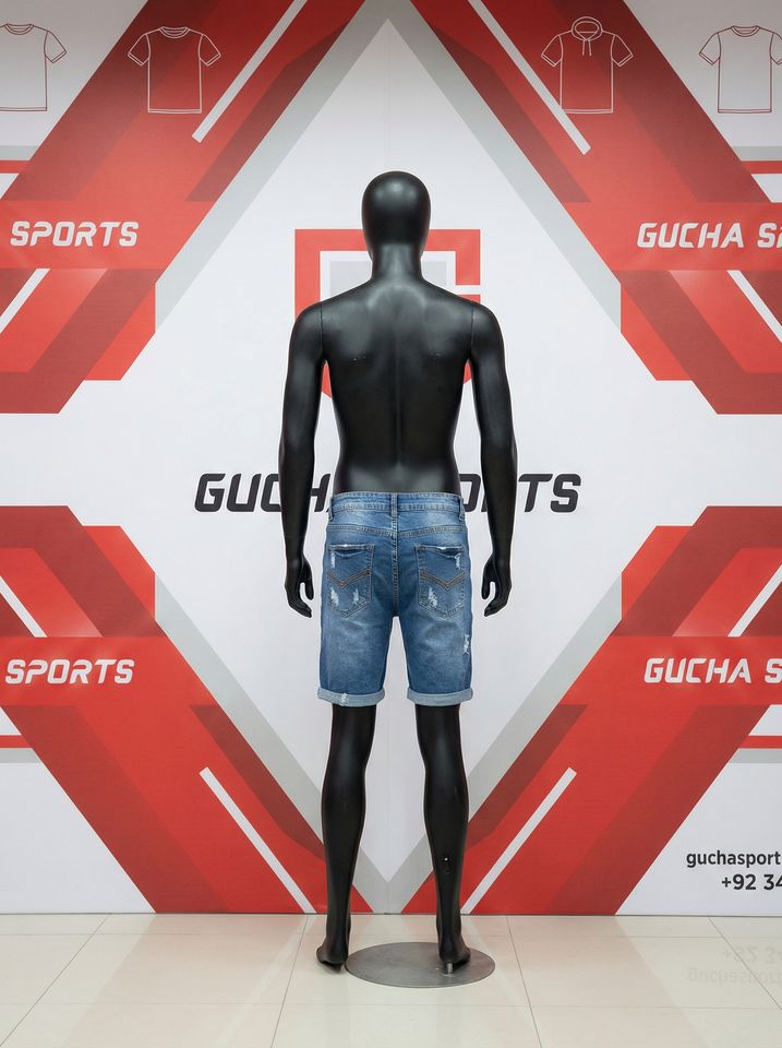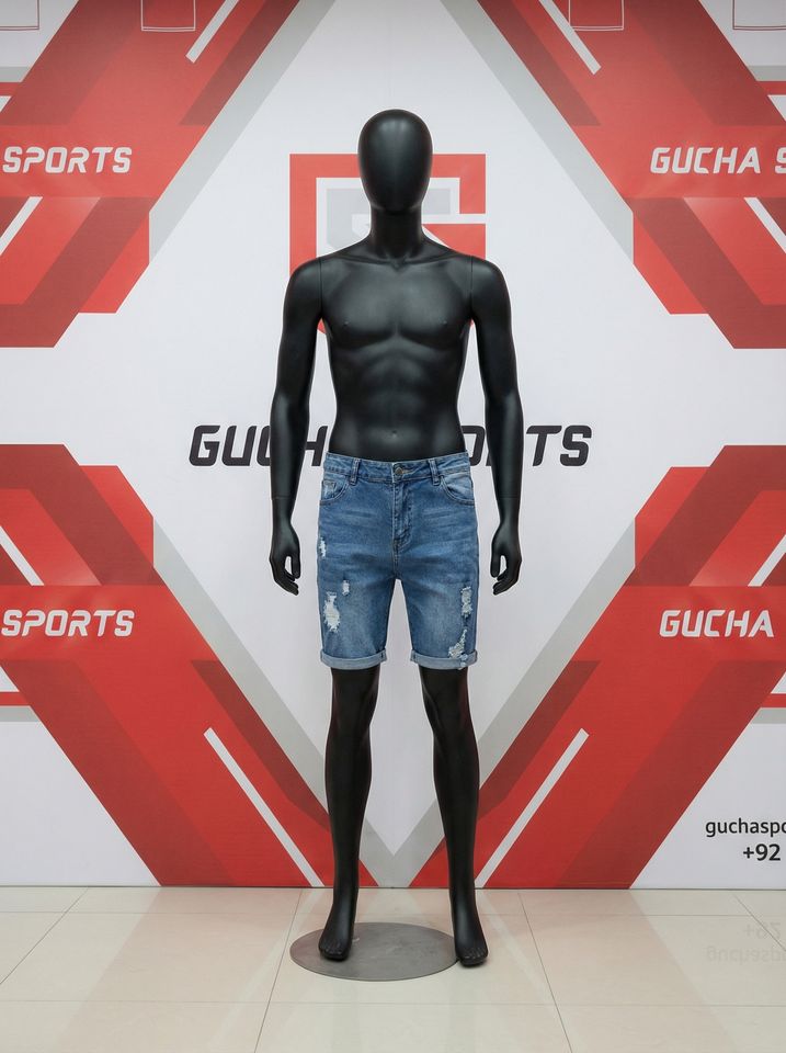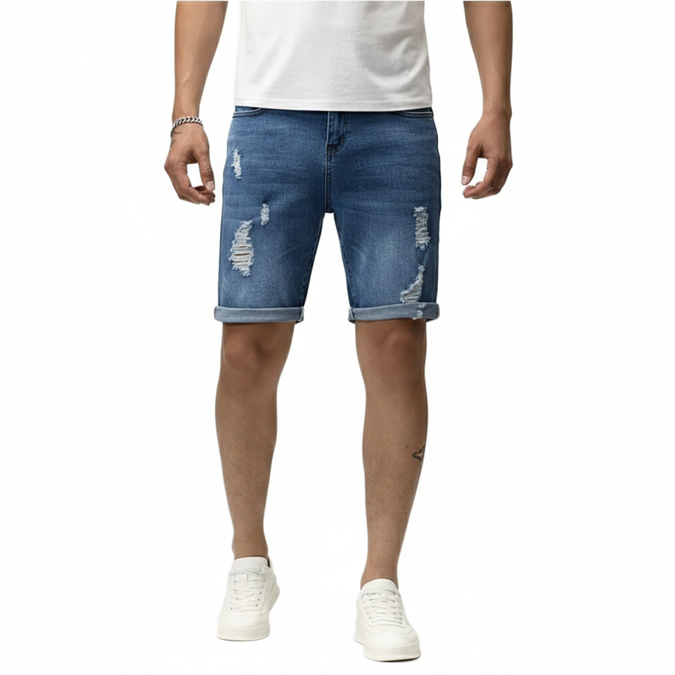 Mens denim shorts with premium stretch fabric, distressed ripped design, mid-rise fit, durable stitching, casual summer wear