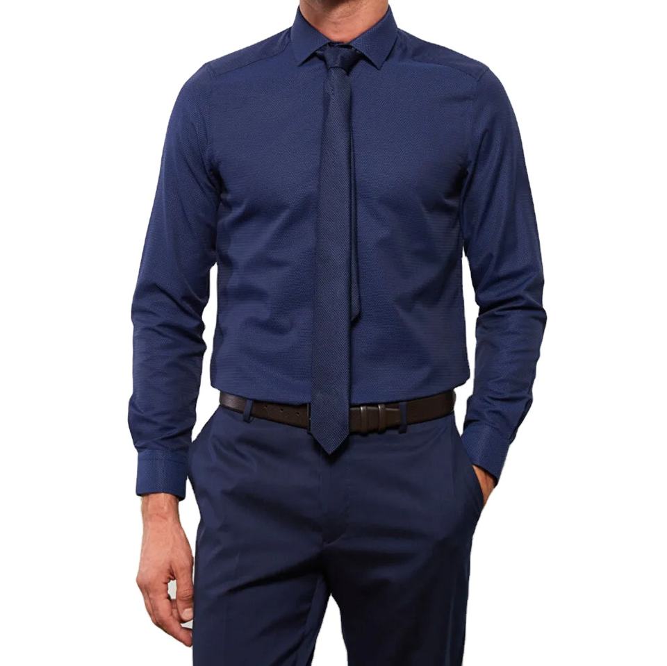 Mens formal slim fit shirt navy blue breathable dobby fabric cotton polyester blend office wear collared OEM bulk supplier