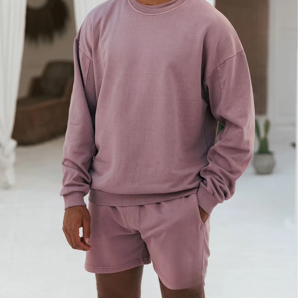 Mens mauve washed cotton fleece sweatshirt and shorts set comfortable casual lounge wear perfect for summer gym or travel