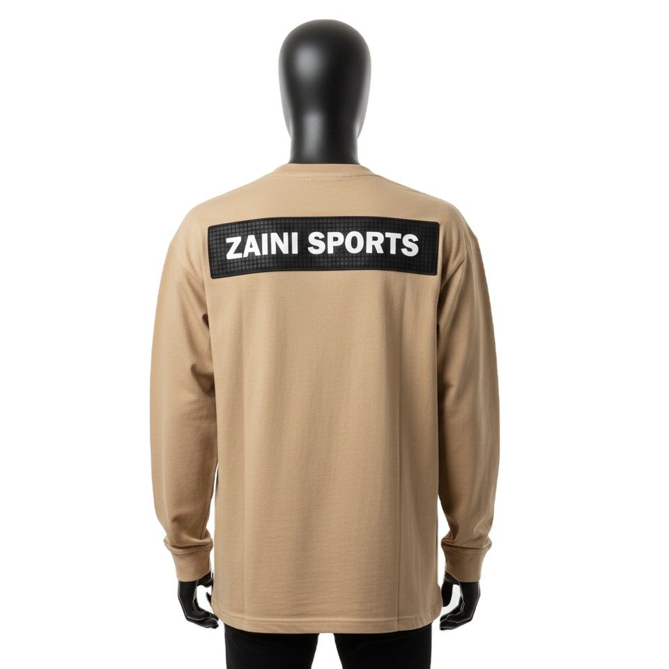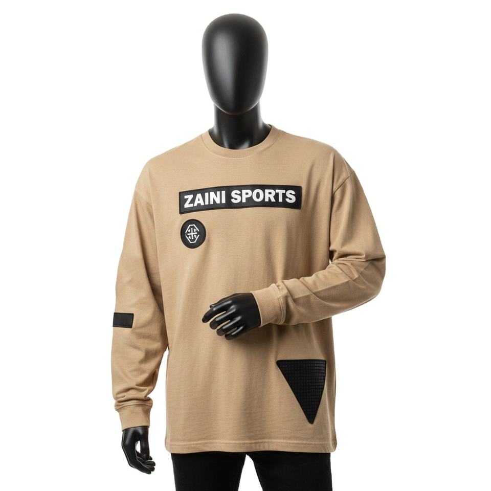 Mens premium 240 GSM cotton knit long sleeve t shirt beige black panel heat transfer logo relaxed street style T-shirt for men