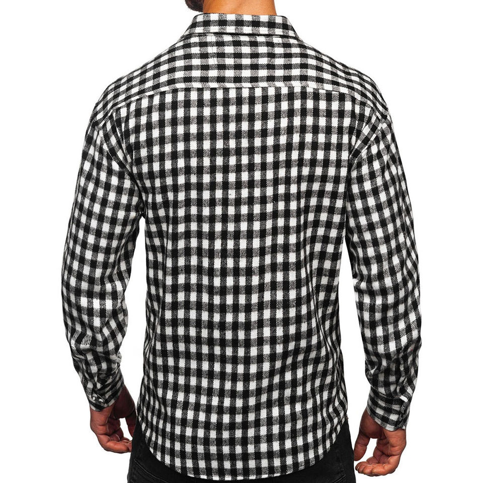 Mens premium cotton flannel shirt in black and white plaid with button closure and adjustable cuffs for slim fit