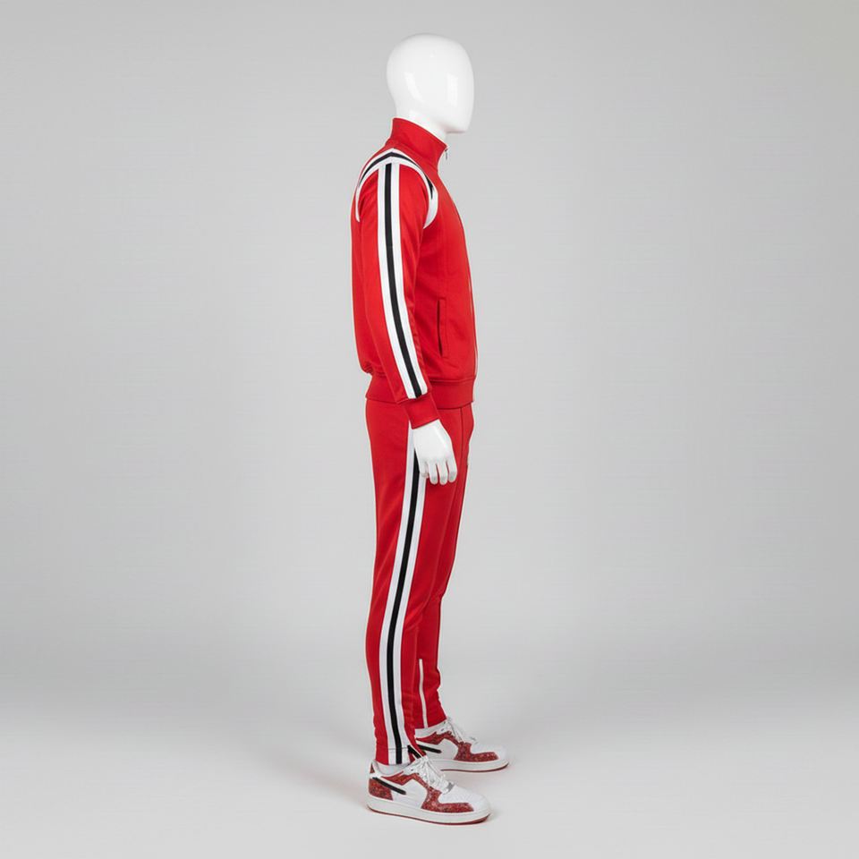Mens red tracksuit set zip up jacket and jogger pants custom logo striped design two piece casual sportswear outfit