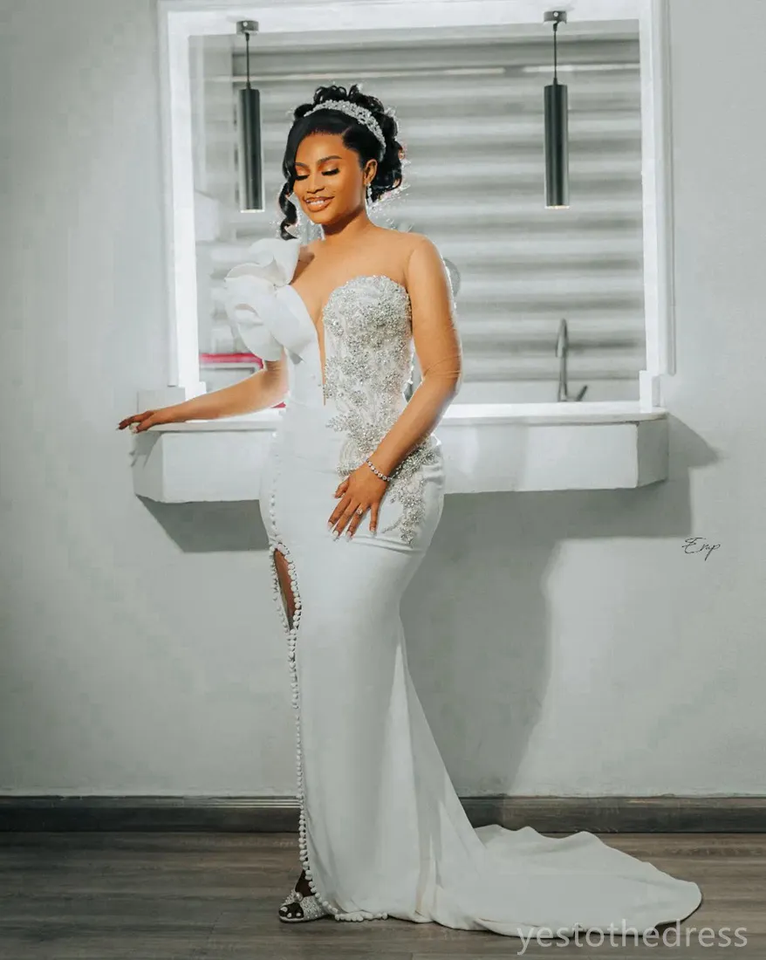 Mermaid Wedding Dress for Bride Illusion Bridal Gowns Neck Sleeveless Side Split Crystals Decorated Wedding Gowns