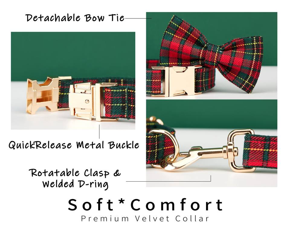 Merry Christmas Personalise Dog Collar Leash Set with Bow,Red+Green+Snow Plaid, Engraved Pet Name Plate Metal Buckle,Santa Puppy