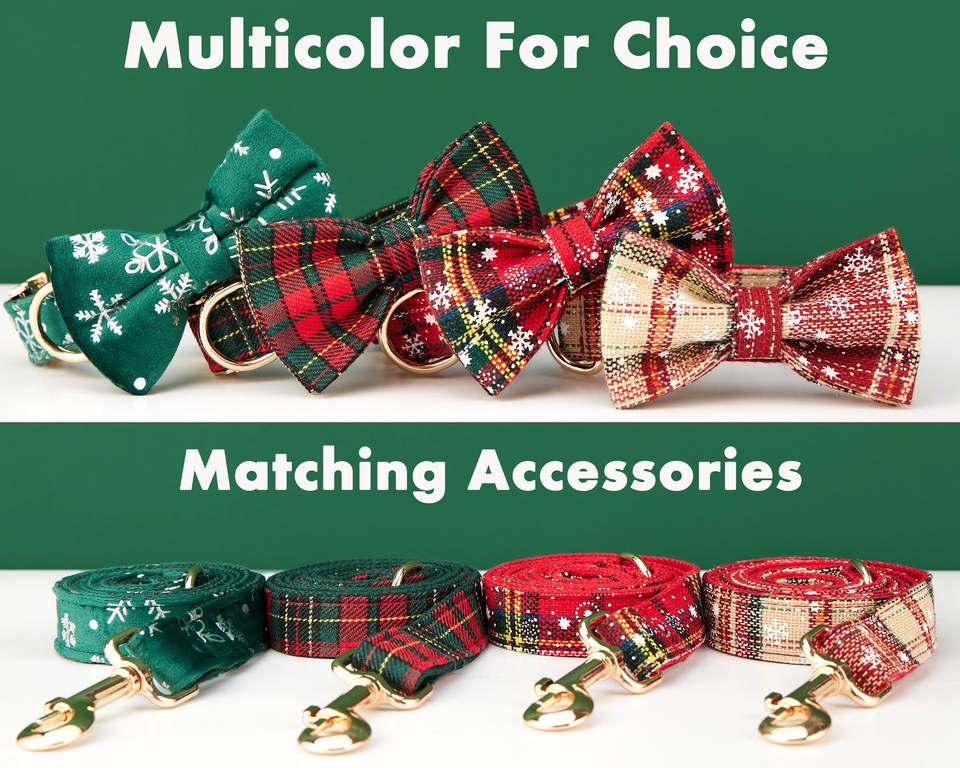 Merry Christmas Personalise Dog Collar Leash Set With Bow,Red+Green+Snow Plaid, Engraved Pet Name Plate Metal Buckle,Santa Puppy