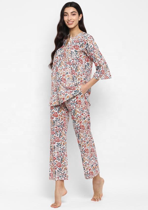 Flora Look Multi Colored Hand Block Floral Printed Soft Cotton Loose Fit Night Suit Designed For Comfortable Sleep