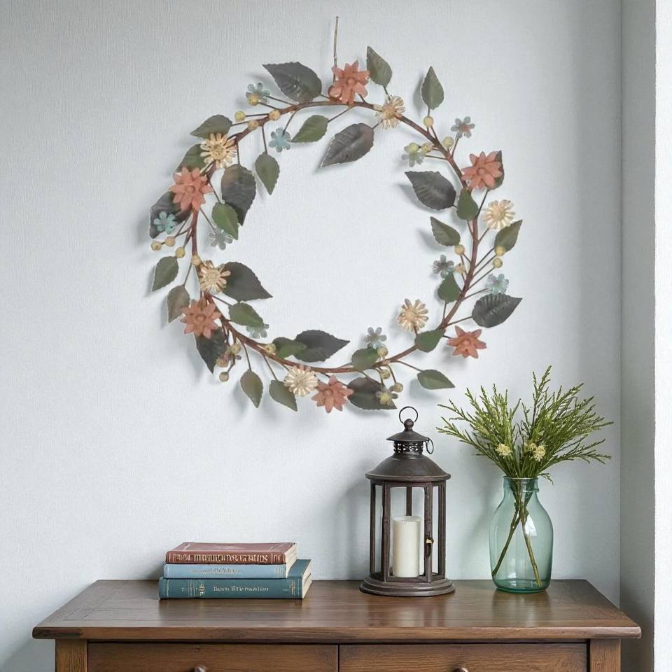 Metal Floral Wreath for Door and Wall Decoration | Handcrafted Metal Flower and Leaf Wreath | Home and Event Decor