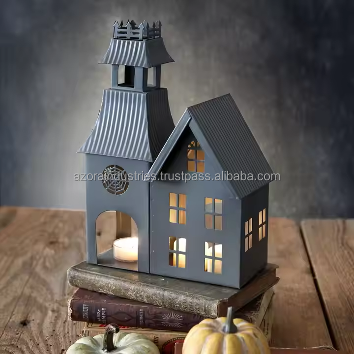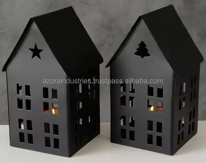 Metal Hut House Shaped Black Lantern for Home Decoration Candle Holder Lantern Halloween Ornament