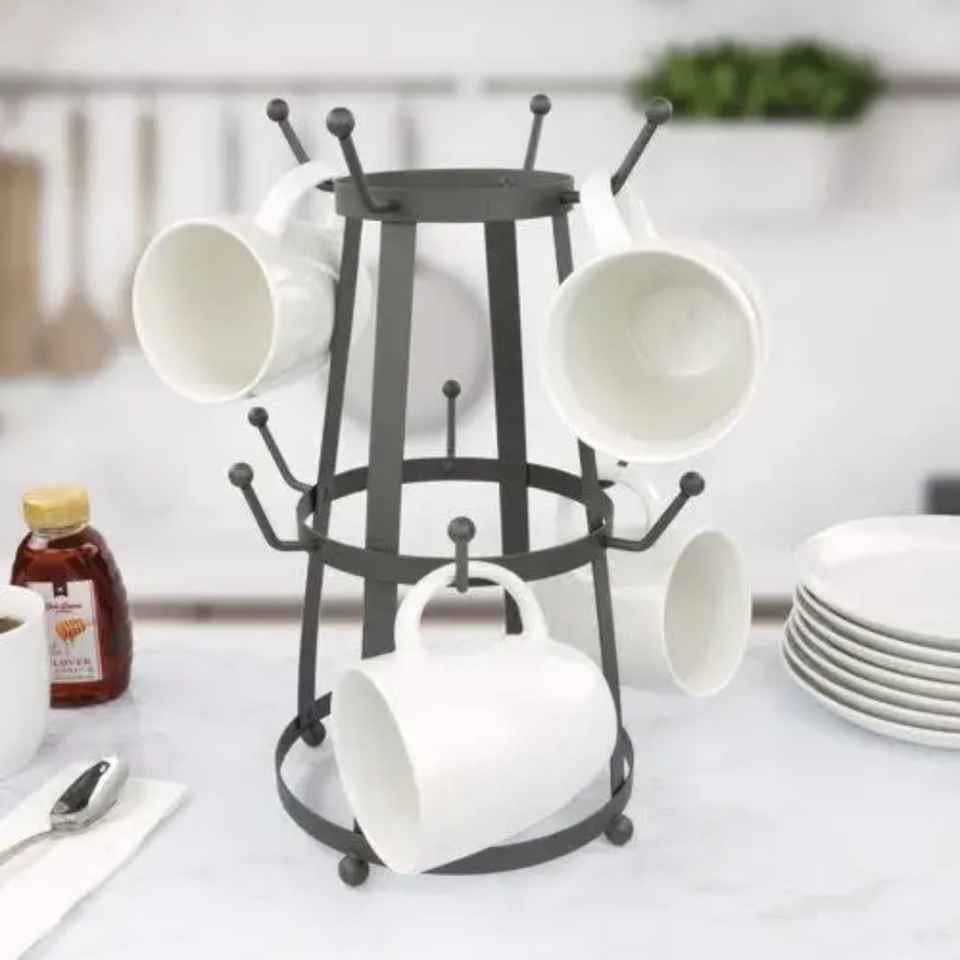 Metal Mug Rack Two Tier Stand With Ceramic Mugs Rustic Artistic Handcrafted Minimalist Modern Kitchen Dining Home Office