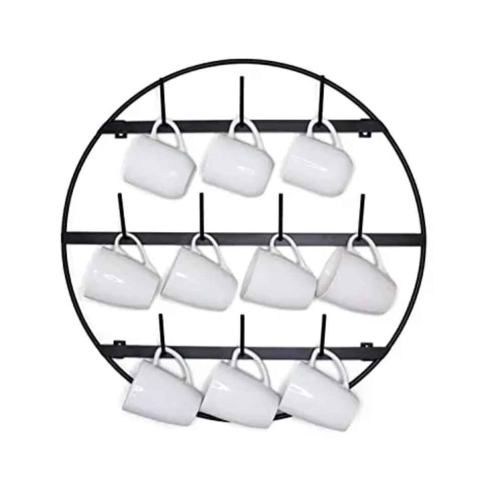 Metal Mug Rack with Vertical Hooks Holding Ceramic Coffee Mugs Red Black Stripe Splatter Pattern Functional Kitchen Organizer