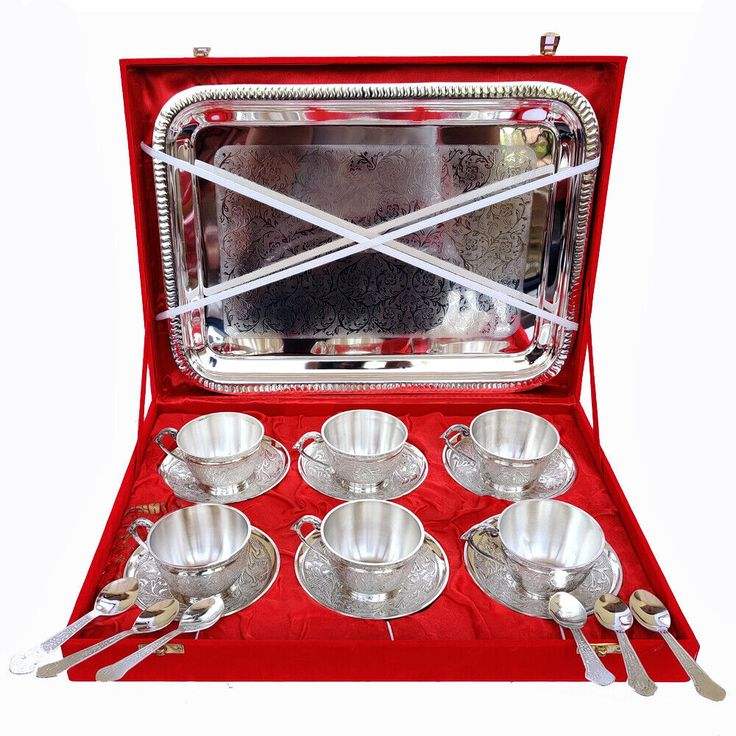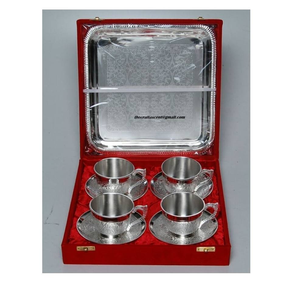 Metal Tea Cups and Saucers Set of 4 Silver Gold Plated Brass Tea Cups or Saucers Bright Colored Tea Cups and Saucers With Tray