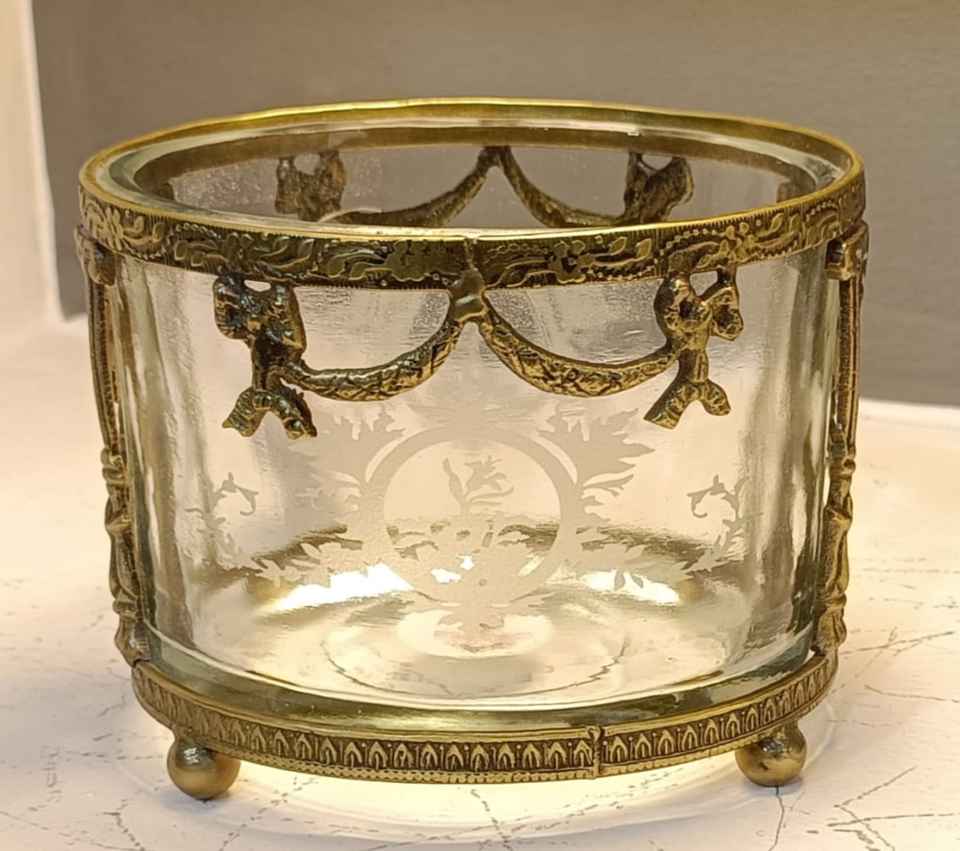 Metal and Glass Butter Bowl Fancy Work Serving Bowl with Golden Metal