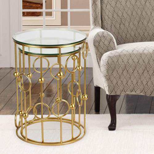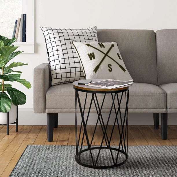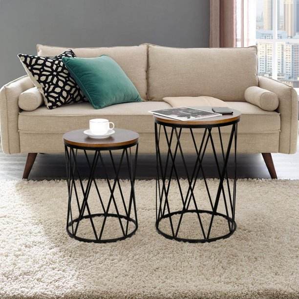 Metal and Wood Table Set of 2 With Black Powder Coated Iron Body and Round Shape Perfect for Home Decor As Stylish Side Tables