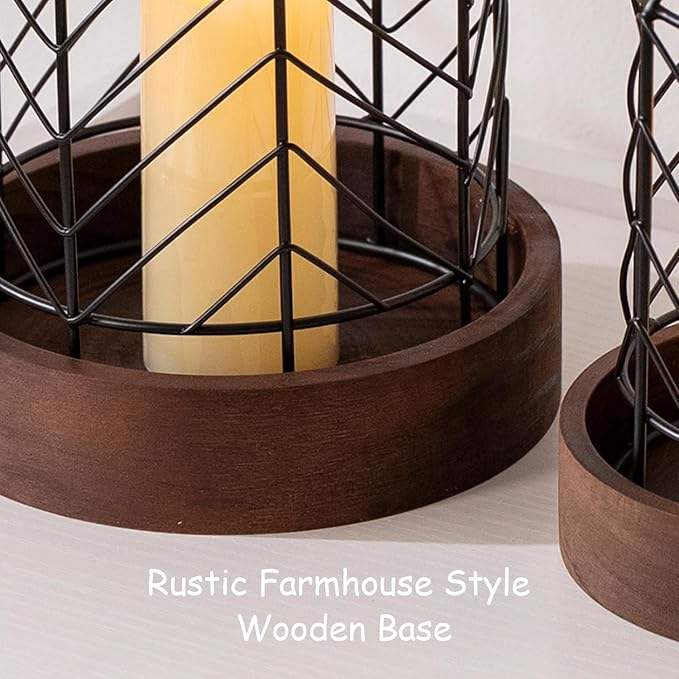 Metal cage Candle Lantern Set of 2 Rustic Wood Candle Holder for Home Decor Living Dining Room Kitchen Fireplace Mantle Decor