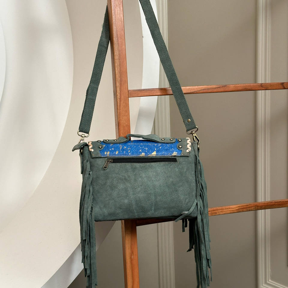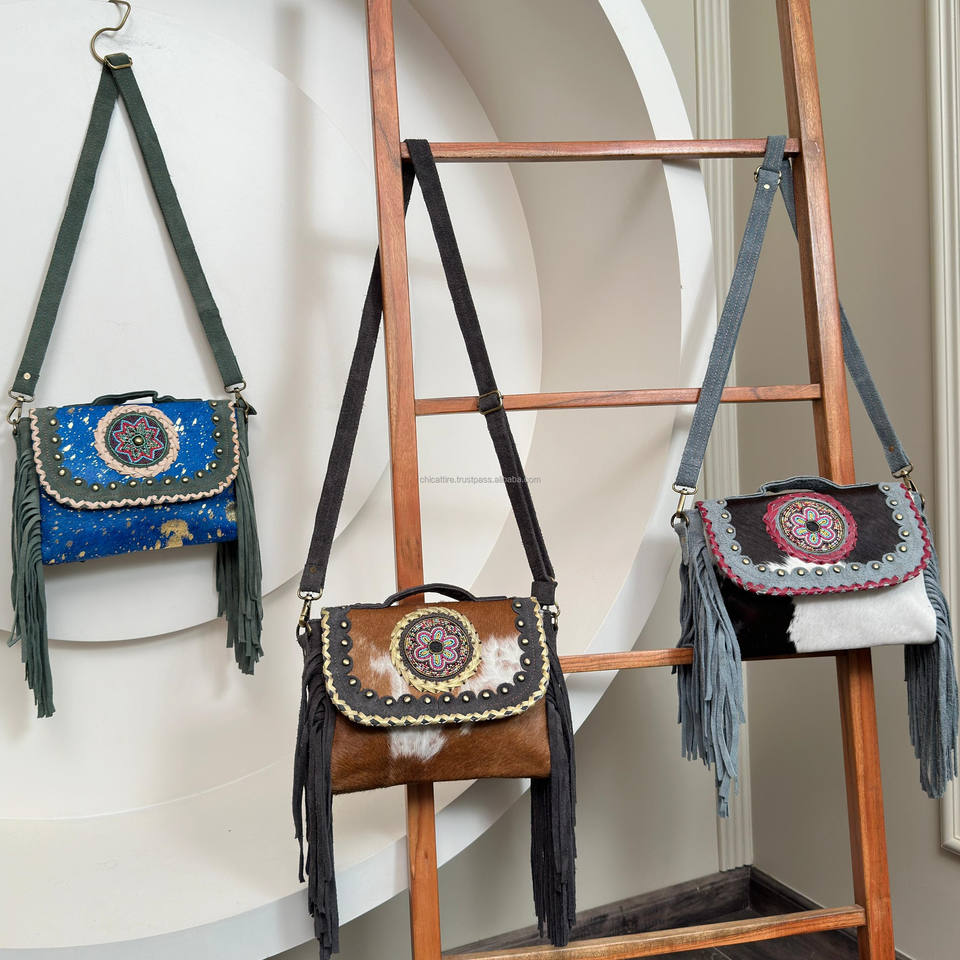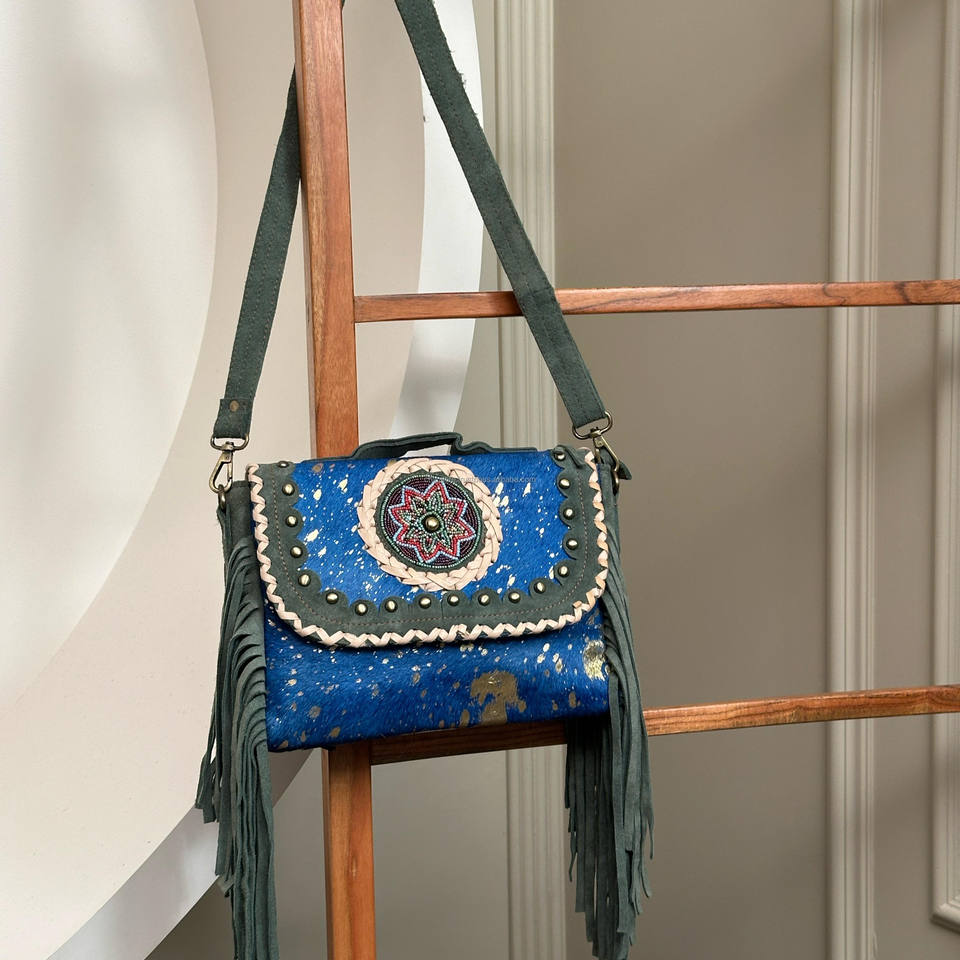 Metallic Hair on Hide Fur Leather Fringe Handbag Western Style Crossbody Sling Purse Women Shoulder Purse