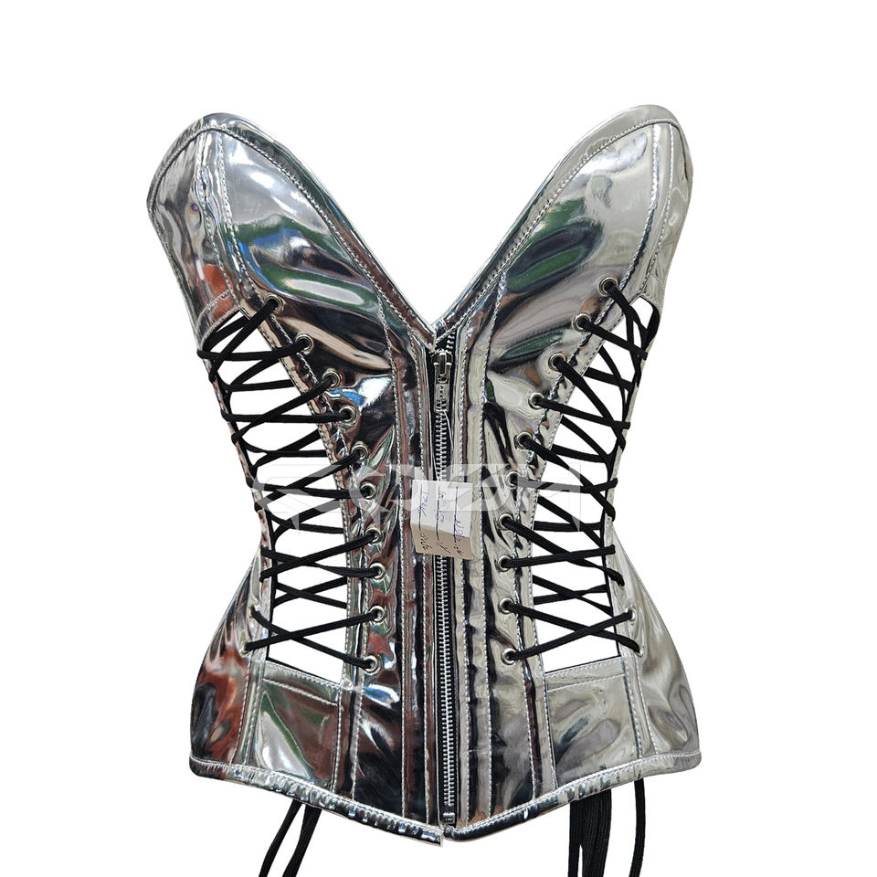 Metallic Silver Deep Neckline PVC Overbust Corset With Front Zipper & Side Lace-Up | Shiny Vinyl Waist Training Fetish Corset