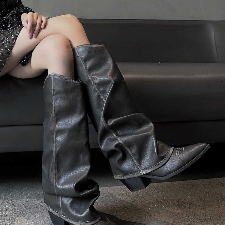 Microfiber Rubber PU Boots with High Tube Winter Knee-High Chunky Heel Fashion Pointed Toe Design