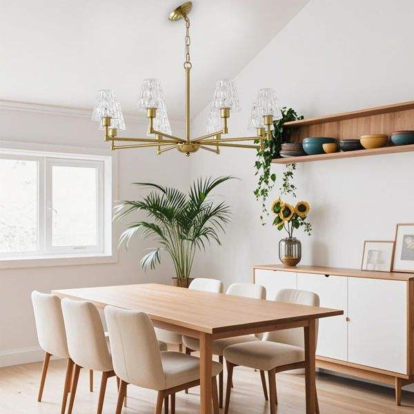 Mid Century 8-Light Gold Pendant Chandelier Modern Farmhouse Fixture for Dining Living or Bedroom Glass and Metal Design