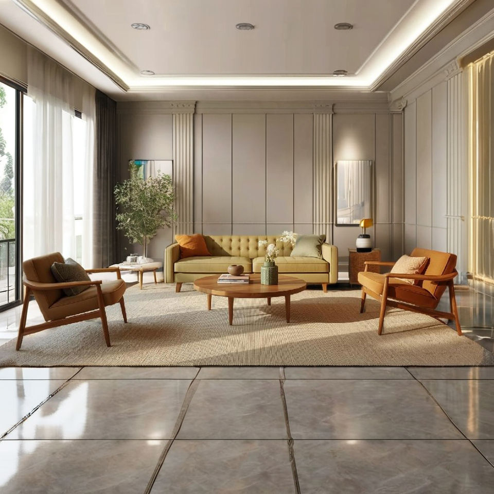 Mid-Century Modern Apartment Furniture Set Slipcovered with Teak round wooden Coffee Table and Center Table with luxury sofa set