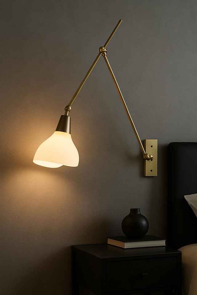Mid Century Modern Brass Swing Arm Wall Sconce: Asymmetric White Shade