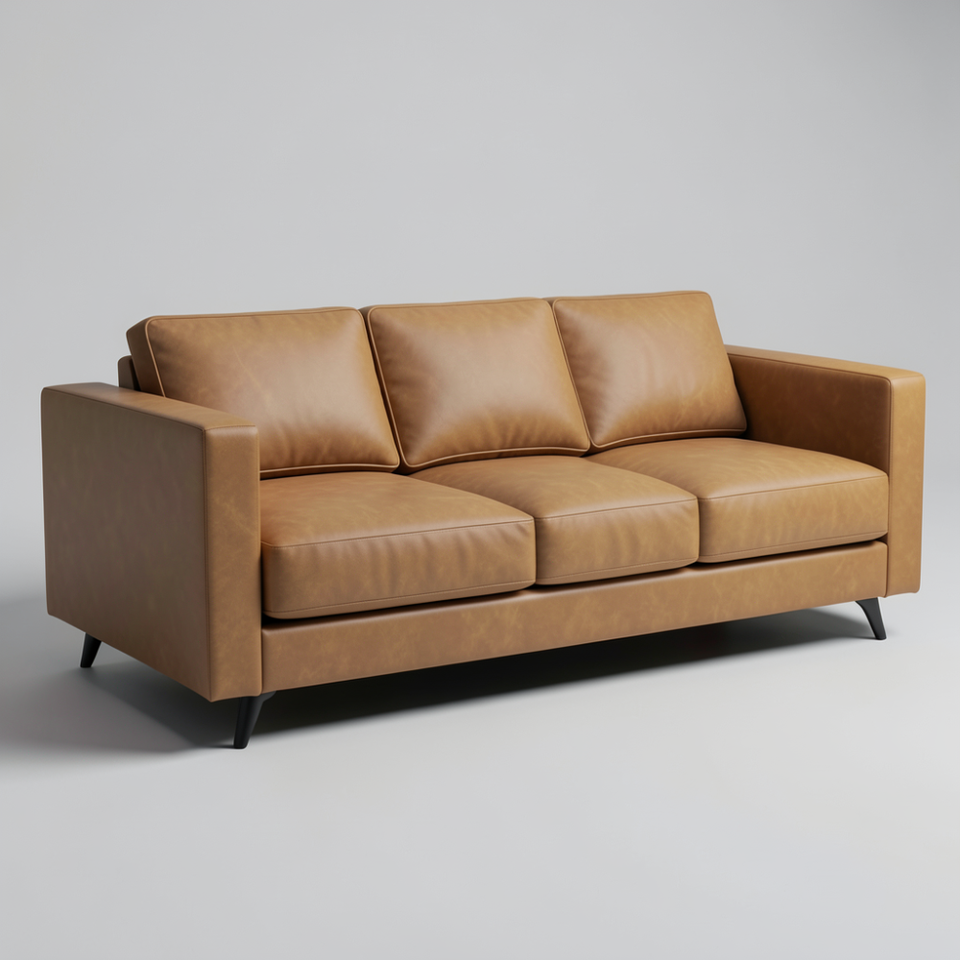 Mid-Century Modern Genuine Cow Leather Sofa 3 Seater Brown Leather Couch with Wood Frame for Stylish Living Room Furniture