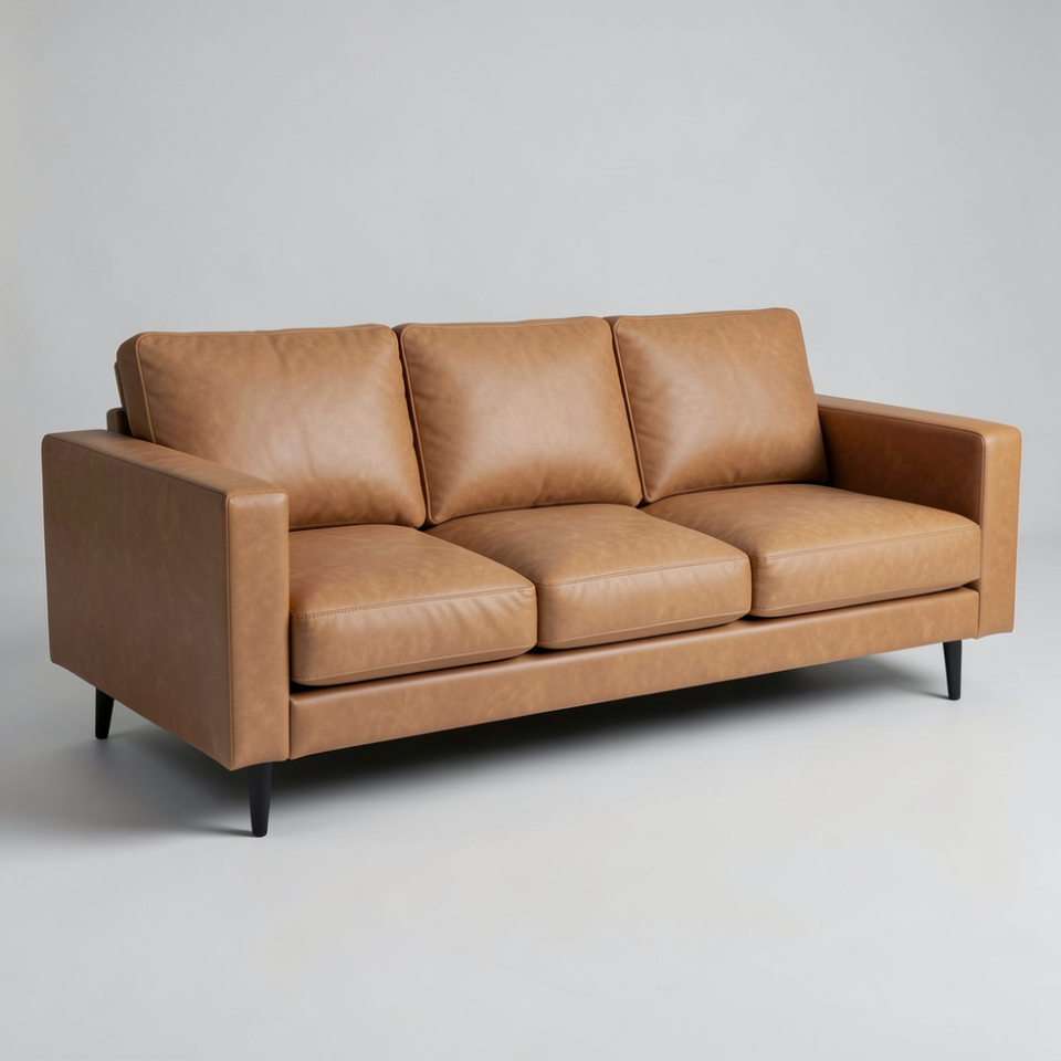 Mid-Century Modern Genuine Cow Leather Sofa 3 Seater Brown Leather Couch with Solid Wood Frame Stylish Living Room Furniture