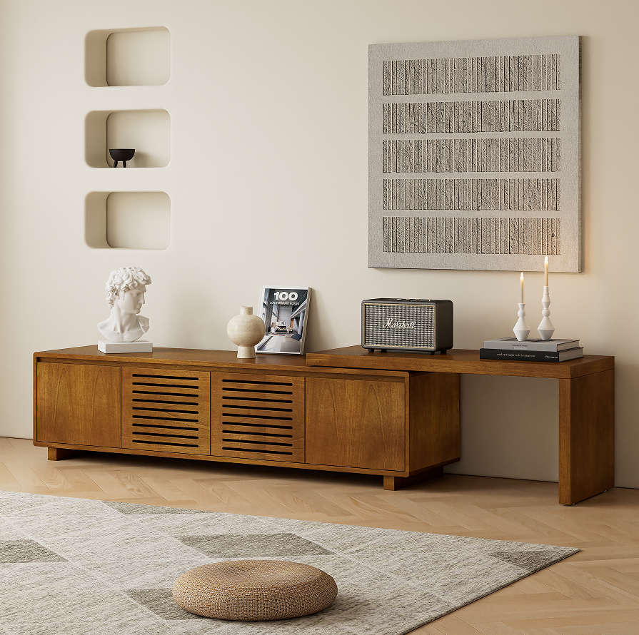 Mid-Century Modern Solid Oak Extendable TV Stand with Adjustable Storage for up to 75" TVs Living Room Media Console