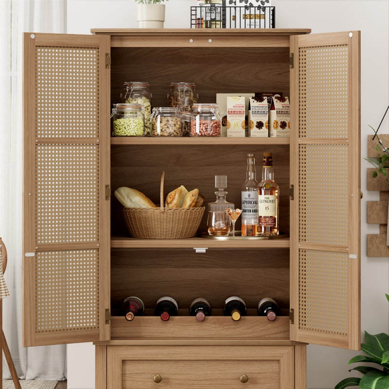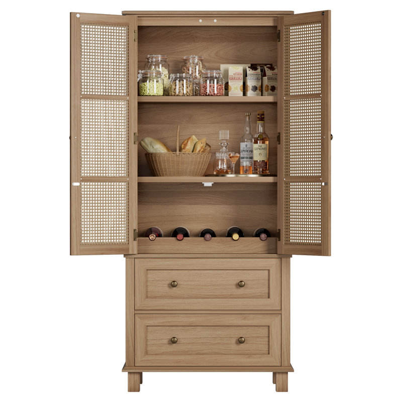 Mid-Century Modern White Wooden Accent Cabinet with 2 Drawers Faux Rattan & Solid Wood Surface for Living Room