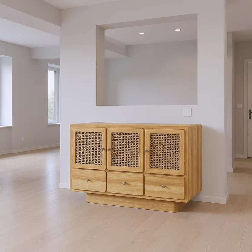 Midcentury Design High Quality Teak Wood Rattan Accent Chest for Apartment Kitchen & Dining Room Furniture