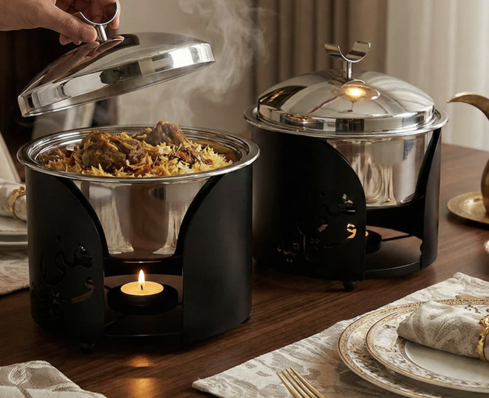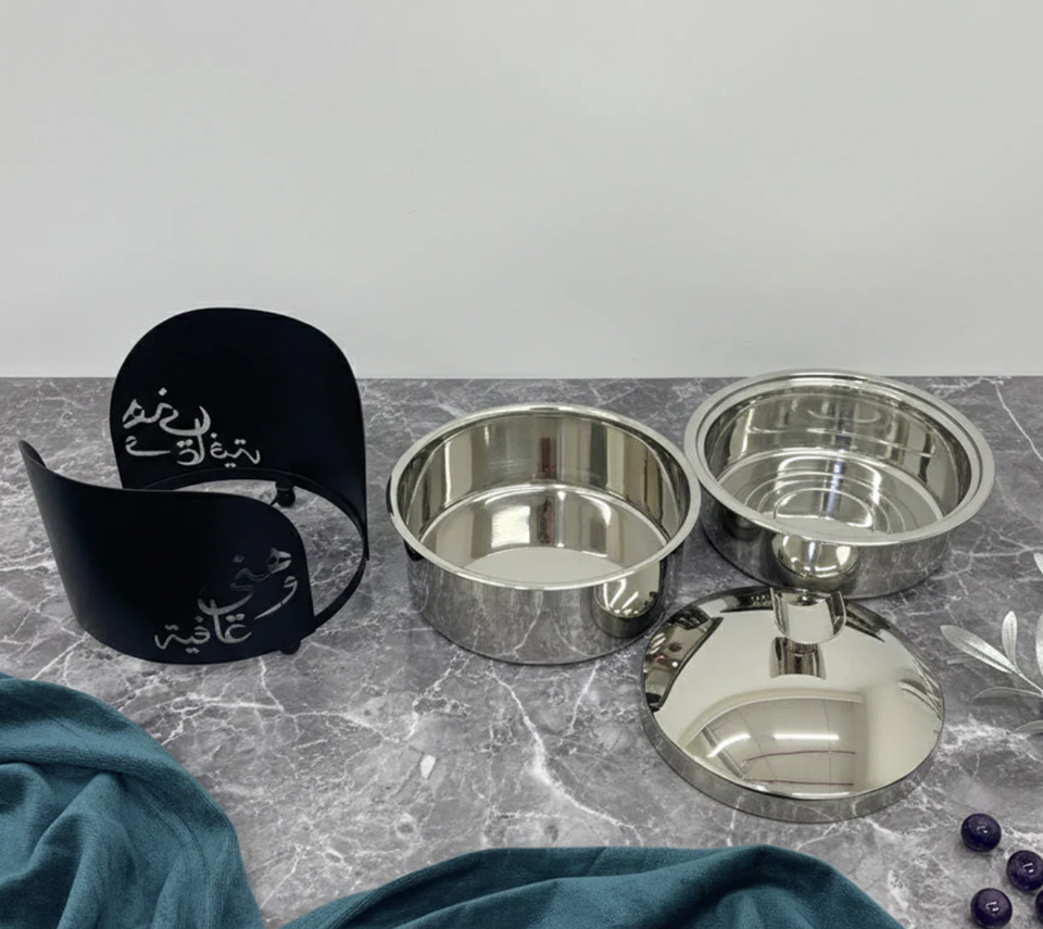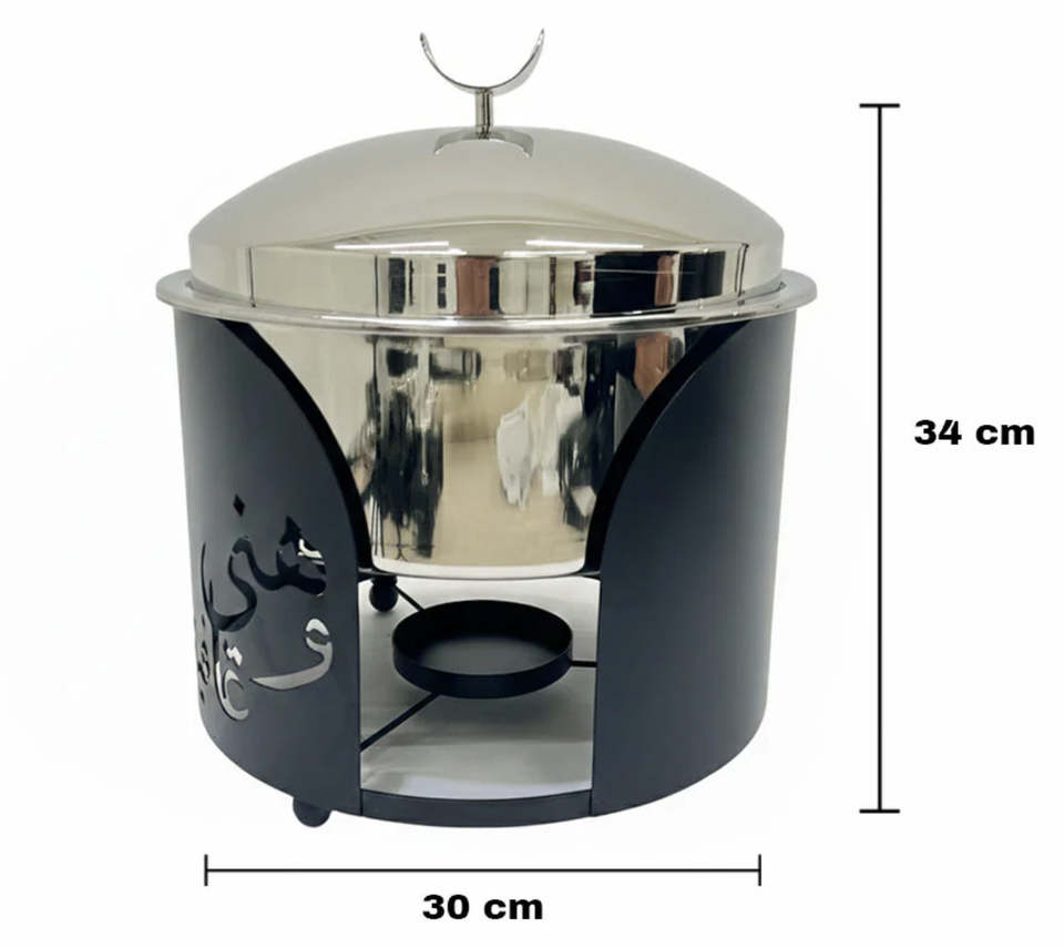 Middle East Look Black Coated Buffet with Calligraphy Design Stainless Steel Lid with Small Knob Casserole Dish Ramadan Serving