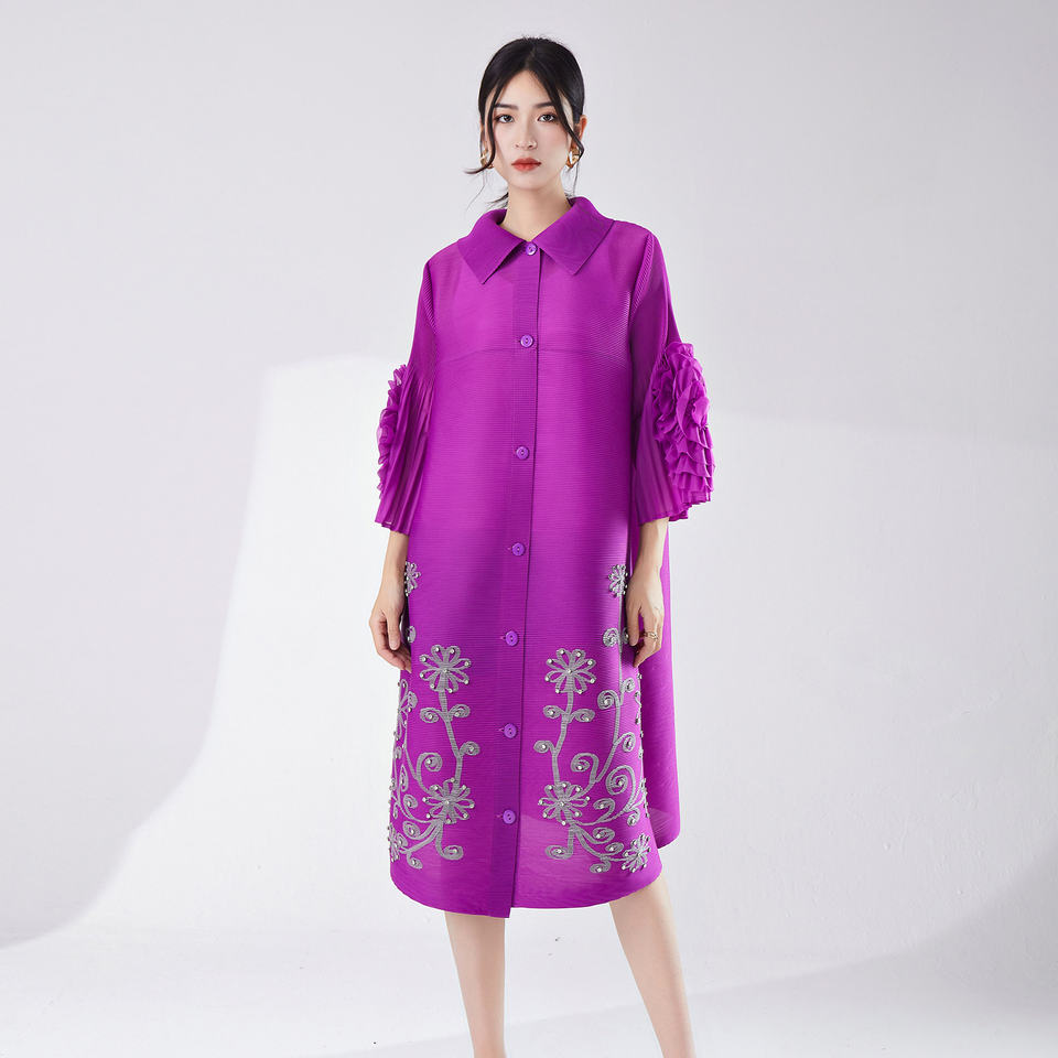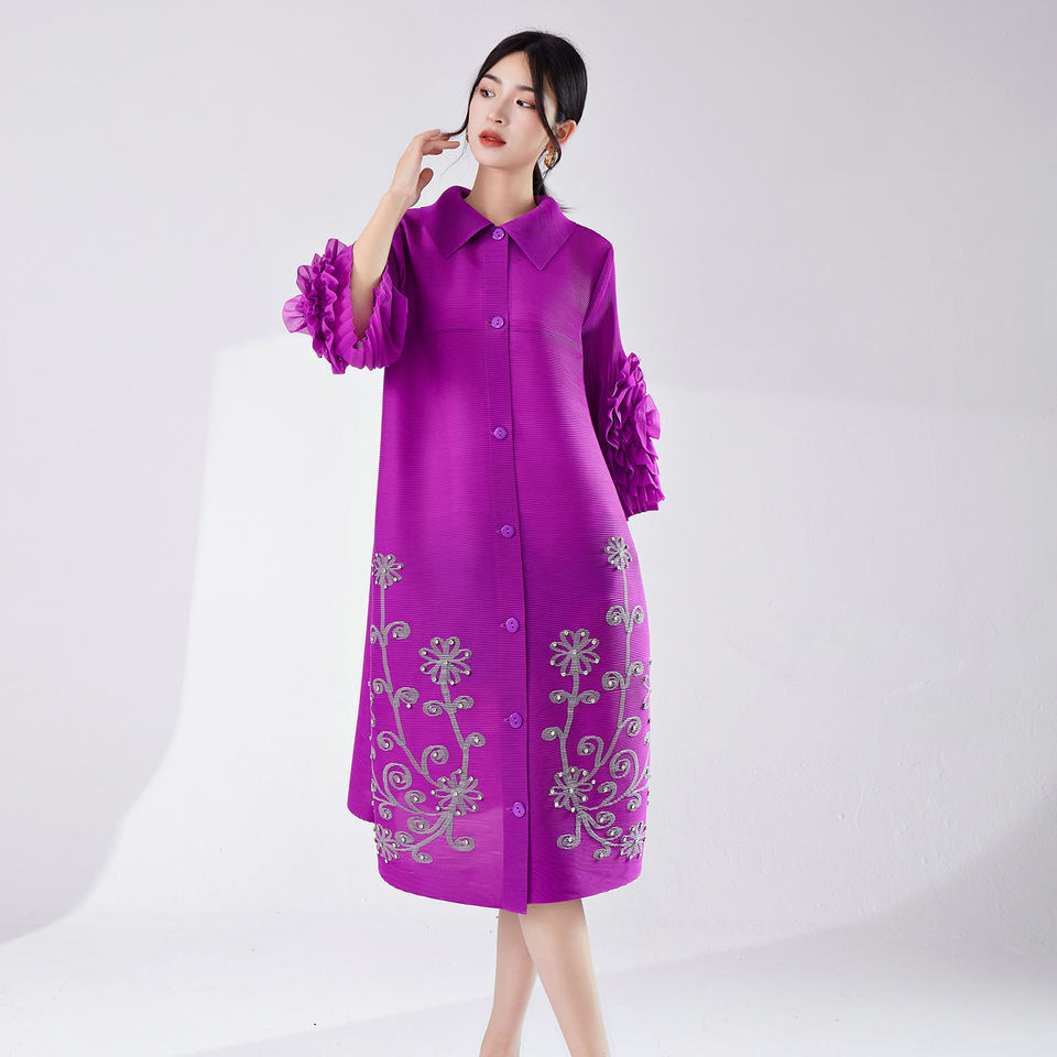 Middle-aged Plus Size Women's Clothing Loose Pleated Dress Single Breasted Cardigan Mid-length Dresses Spot Wholesale or ODM