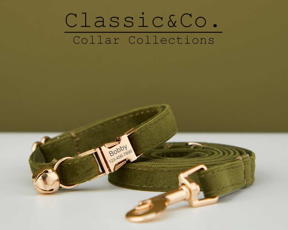 Militarygreen Veet Personalized Cat & Small Dog Collar Bow Tie Leash Set,Free Engraved Kitten Puppy Name Tag,Gold Bell,Pet