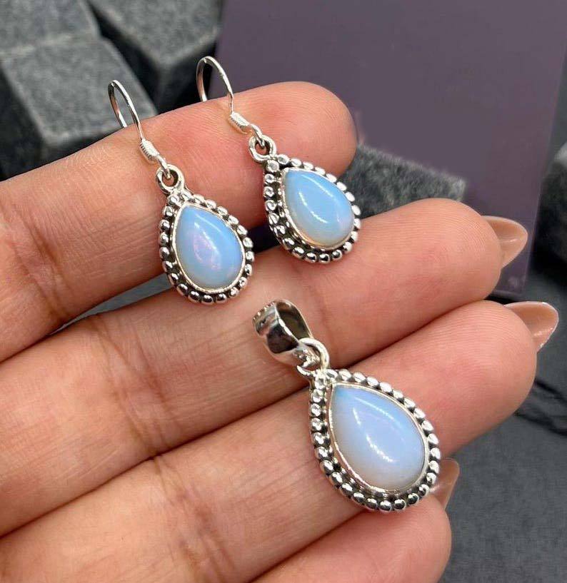 Milky Opalite Gemstone Earrings Pendant Set Jewelry for Women Boho Style Jewelry 925 Sterling Silver Trending Handmade Earrings