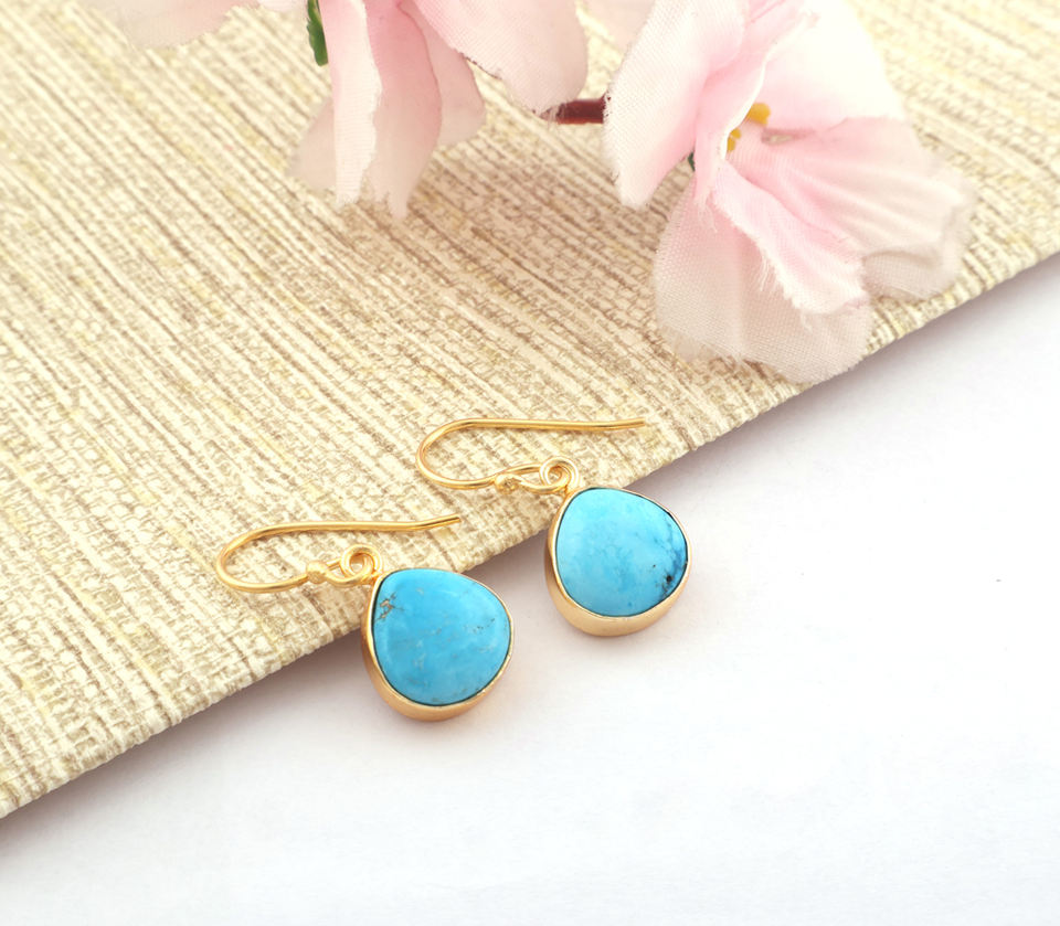Mini Heart Shape Drops Howlite Turquoise Collet Setting Dangle Drop Earring Brass Gold Plated Small Pair Gemstone Hook Dangler