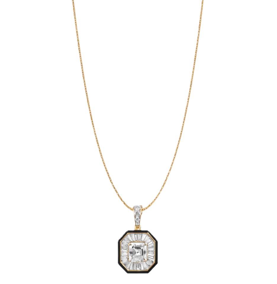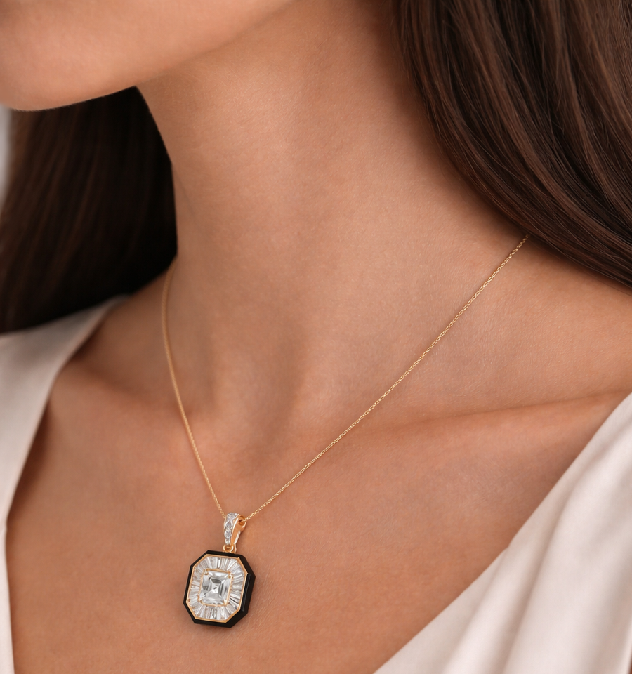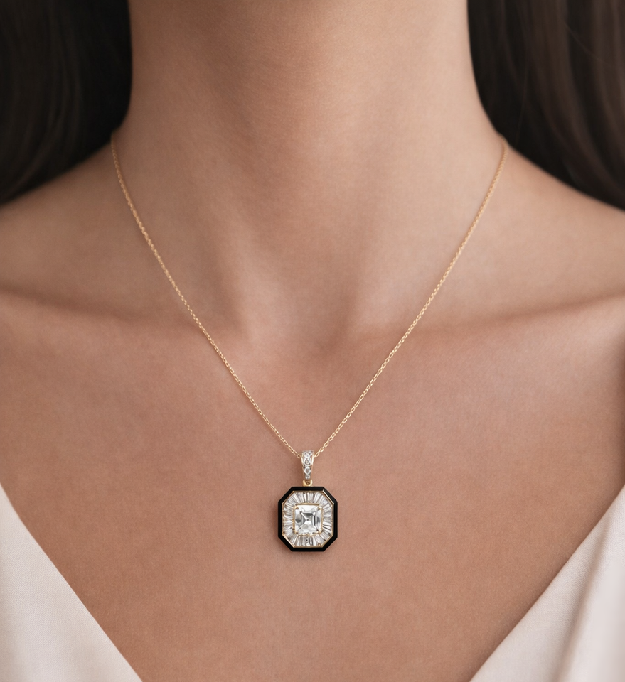 Minimal Lab Grown Diamond Pendant Necklace Art Deco Design 9K 10K Yellow Solid Gold Baguette Asscher Diamond Pendant Necklace