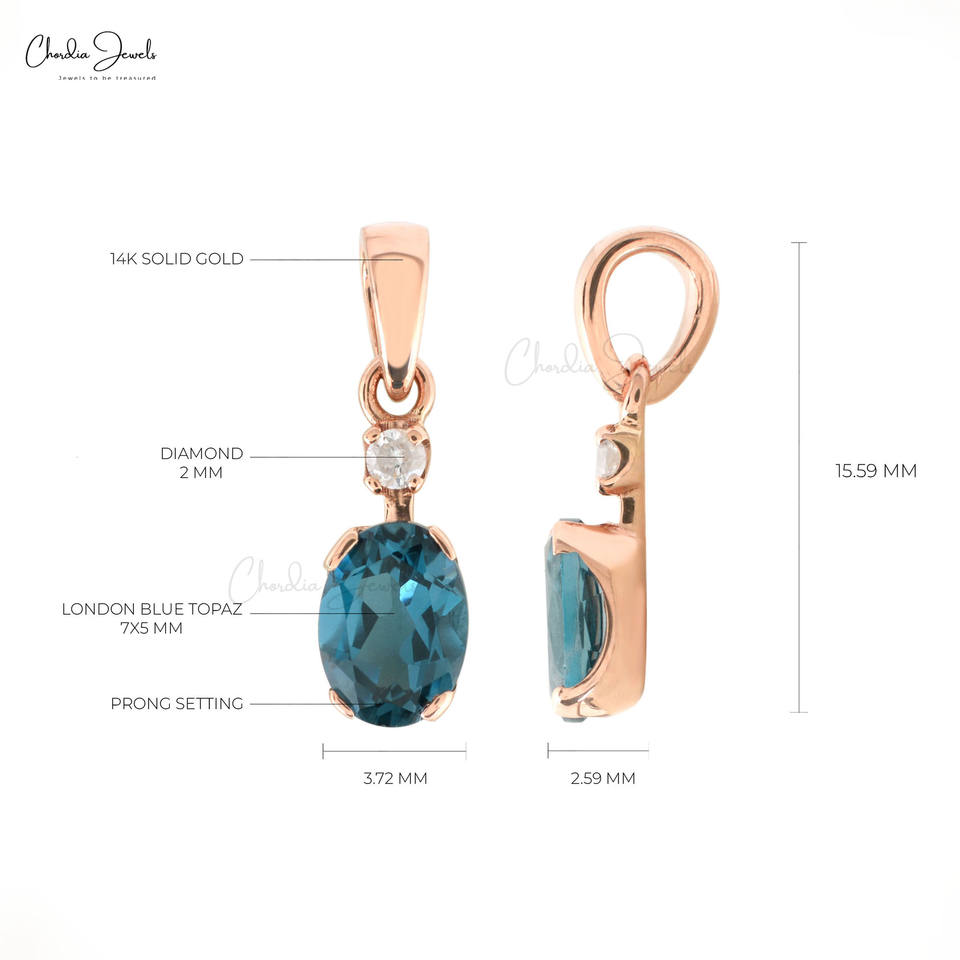 Minimalist 14K Real Rose Gold Pendant Necklace with 7x5MM Oval Cut Natural London Blue Topaz Gemstone & Diamond Charm