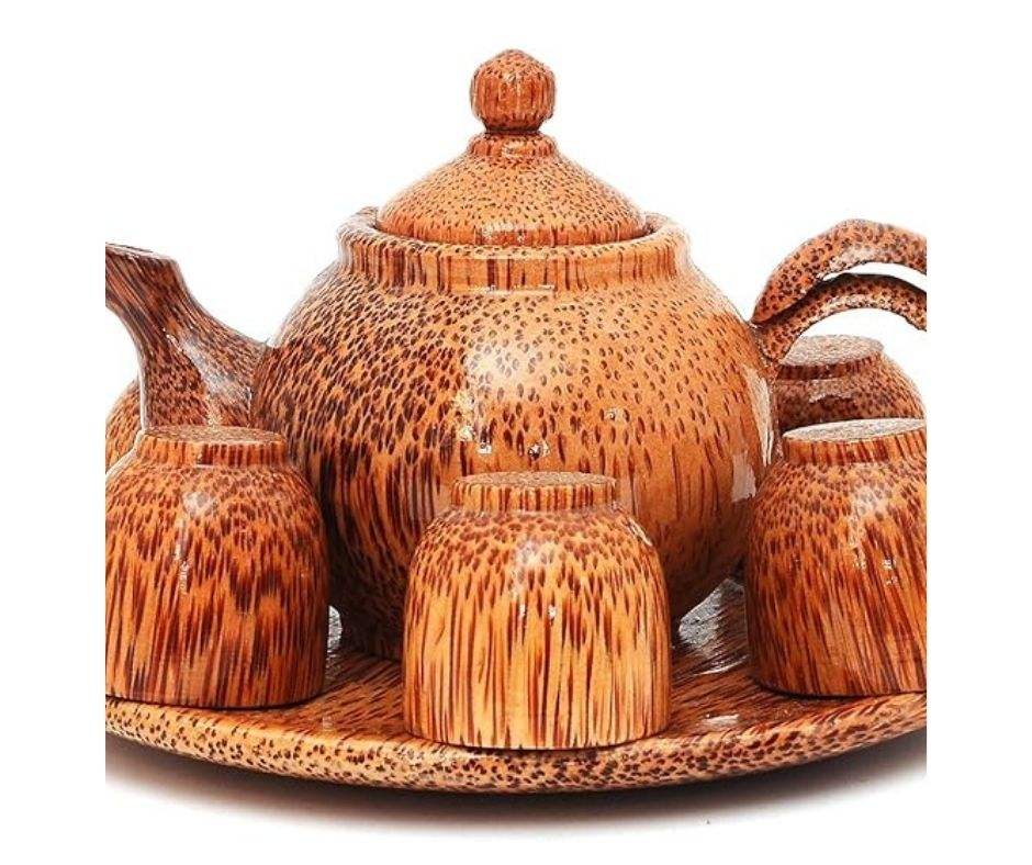 Minimalist Coconut Tea Set from Vietnamese Skillful Craftsmen, Durable Wooden Pot, Cups & Tray for Coffee Shops or Household Use