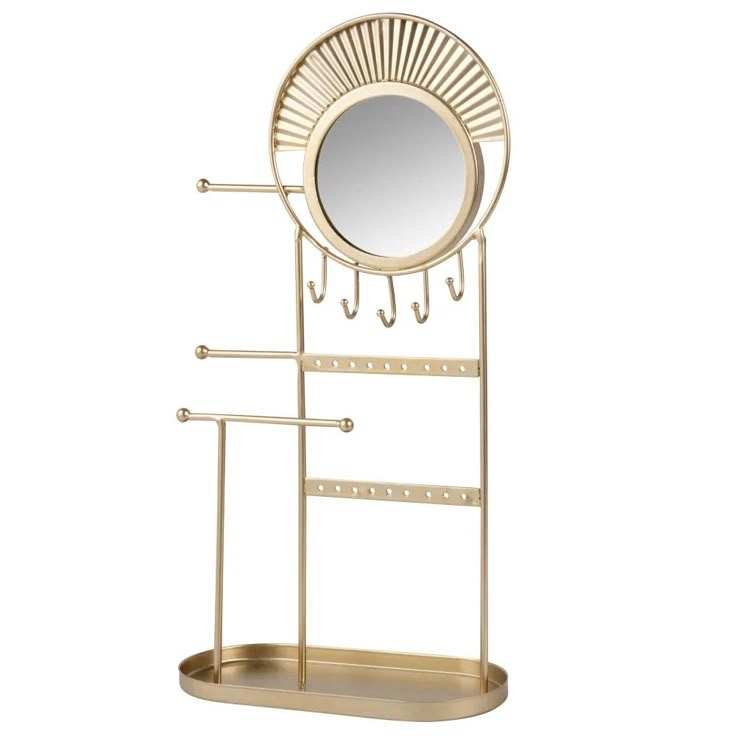 Minimalist Gold Metal Jewelry Display Stand with Mirror for Rings and Necklaces Stylish Storage for Home Decor