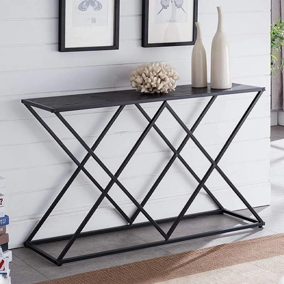 Minimalist Industrial Console Table - Long Natural Wood Top with Durable Black Metal Open Frame - Versatile Entryway Bench