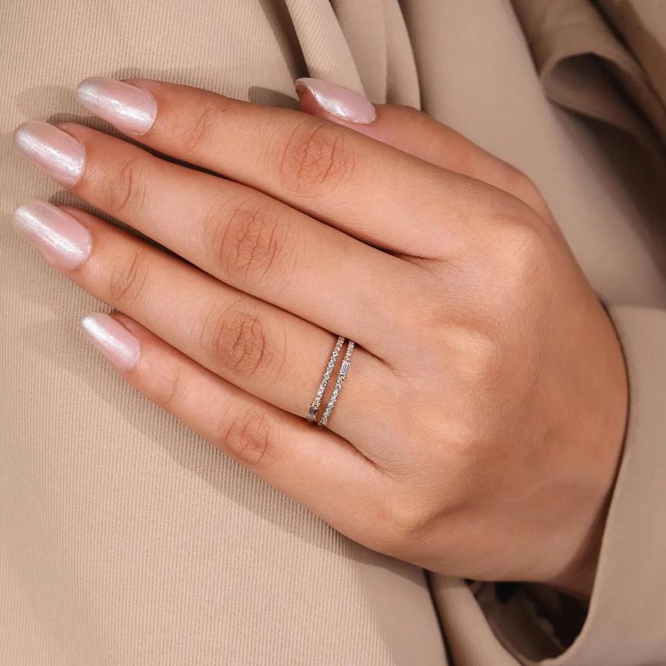 Minimalist Luxury Baguette Cut CZ Diamond Engagement Ring Split Shank Pave Set Half Eternity Wedding Band Sterling Silver Gold