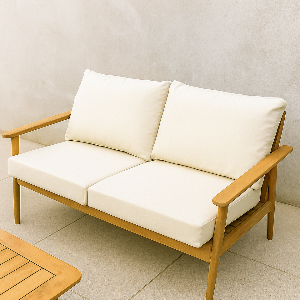 Minimalist Modern Solid Wood Outdoor Sofa Set with White Cushions Coffee Table for Garden Patio Balcony Furniture