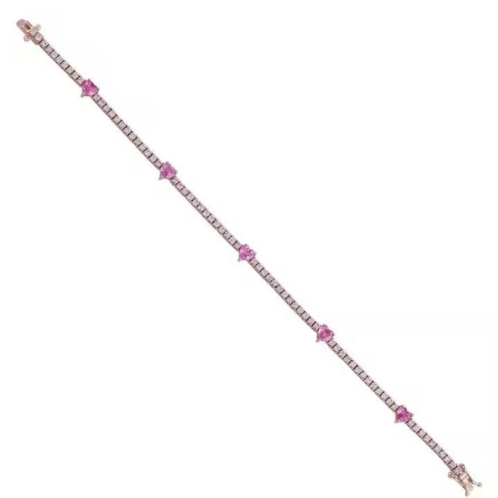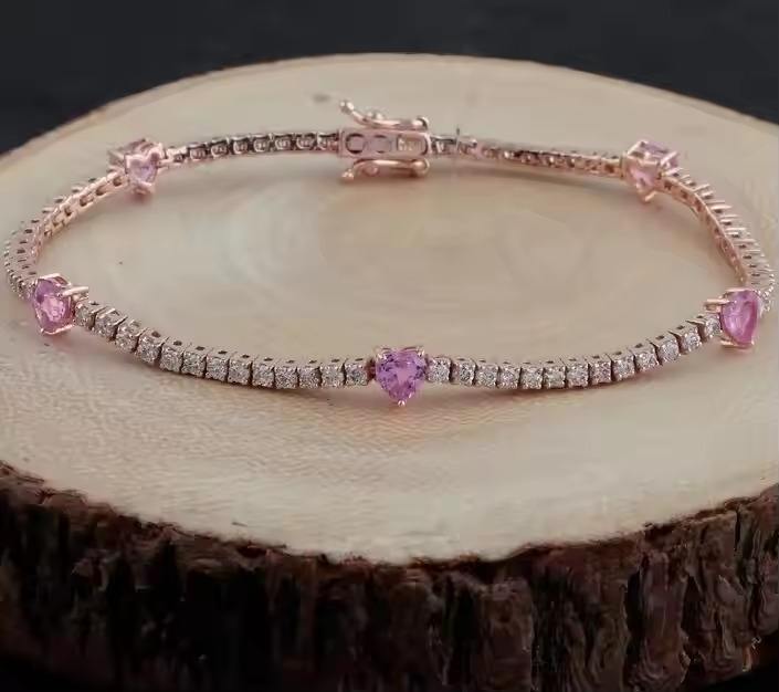 Minimalist Wedding Bracelet with Heart Pink Sapphire & Cut Diamond 18K Rose Gold Gift